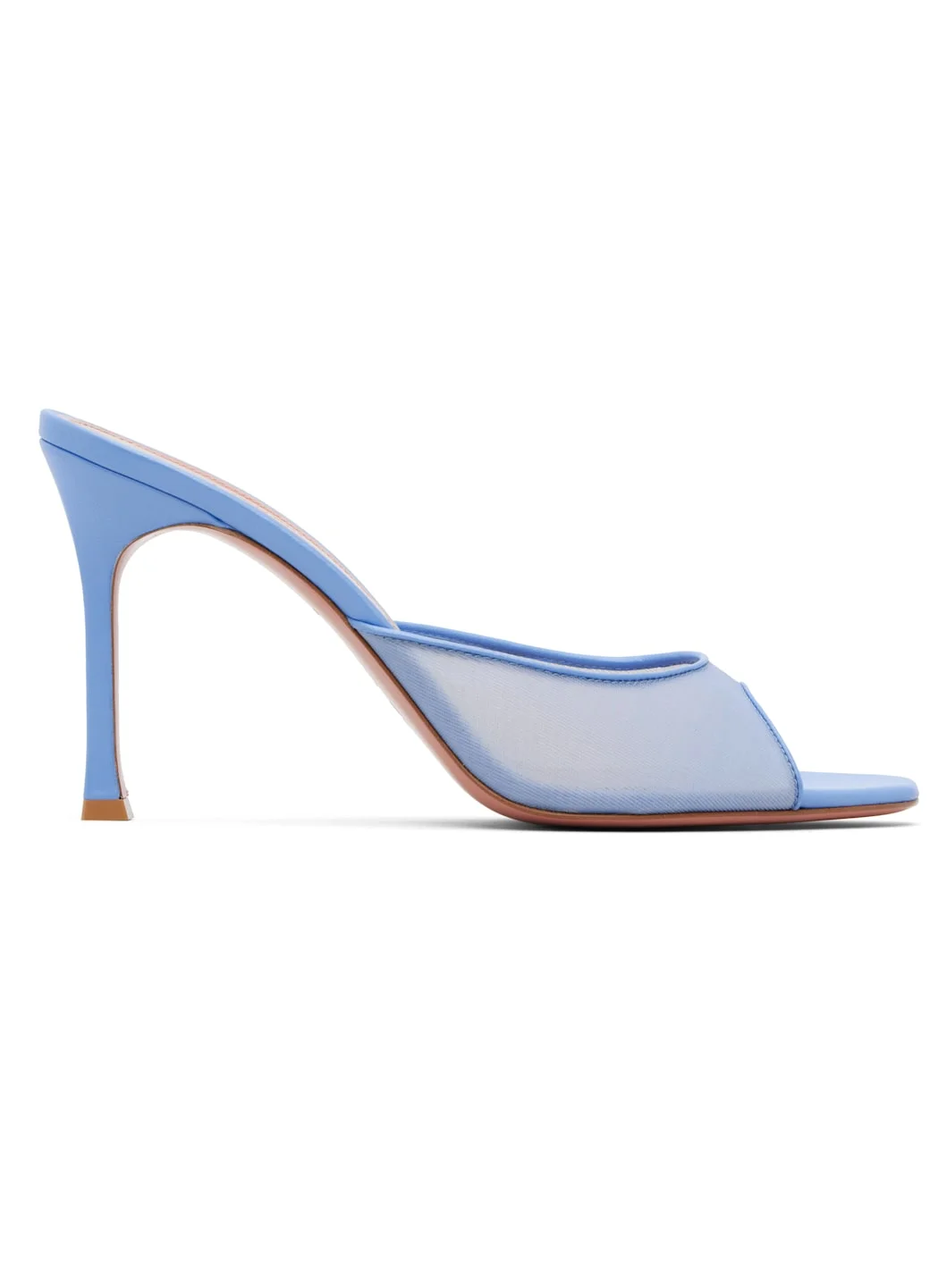 Semi-sheer mesh heeled sandals. · Open toe · Buffed leather trim at vamp · Logo embossed at padded leather footbed · Leather-covered stiletto heel with rubber injection · Leather sole with rubber injection · Heel: H3.75" Supplier color: Baby Blue Mesh Upper: textile. Sole: leather, rubber. Made in Italy 261415F125036