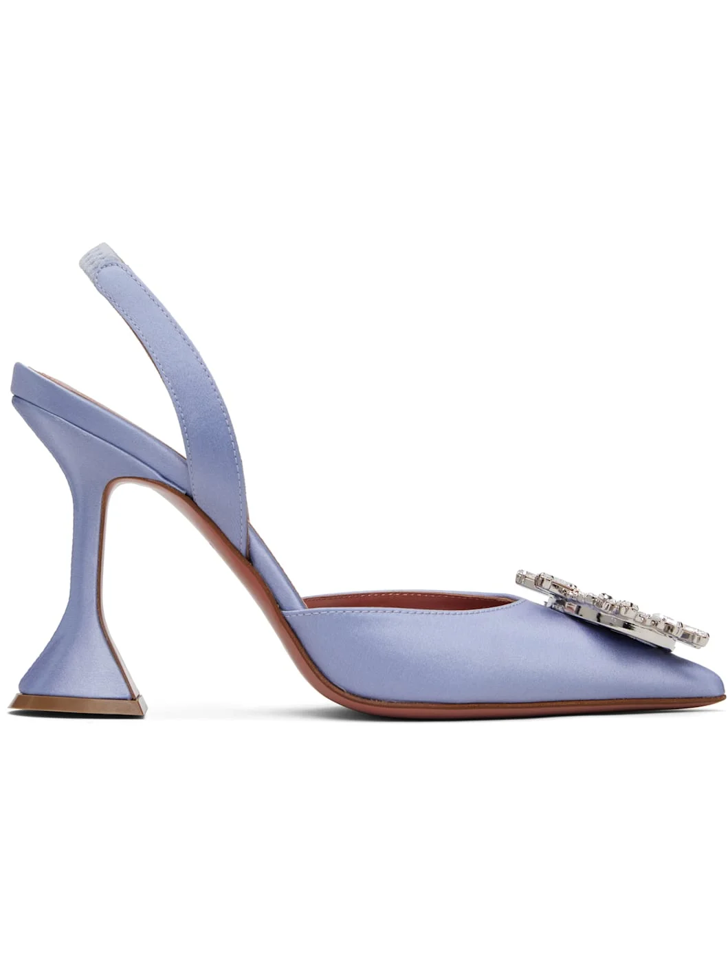 Satin heels. · Pointed toe · Crystal-cut applique at vamp · Partially elasticized slingback strap · Logo embossed at footbed · Spool heel with rubber injection · Polished leather sole with rubber injection · Heel: H3.75" Supplier color: Lilac Grey Satin Upper: textile, leather. Sole: leather, rubber. Made in Italy 261415F122034