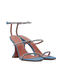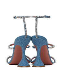 Nubuck heeled sandals in blue. · Trompe l'œil graphic printed throughout · Open square toe · Elasticized straps at vamp · Pin-buckle ankle strap · Crystal-cut detailing at straps · Logo embossed at buffed goatskin footbed · Covered spool heel with rubber injection · Leather sole with rubber injection · Heel: H3.75" Supplier color: Denim Upper: leather. Sole: rubber, leather. Made in Italy 242415F125017