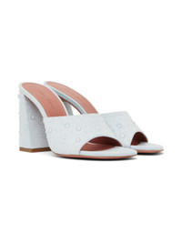 Denim heeled sandals in blue. · Transparent appliques throughout · Open square toe · Logo-embossed grained goatskin footbed · Covered block heel · Leather sole with rubber injection · Heel: H4" Supplier color: Light denim Upper: textile. Sole: leather, rubber. Made in Italy 242415F125030