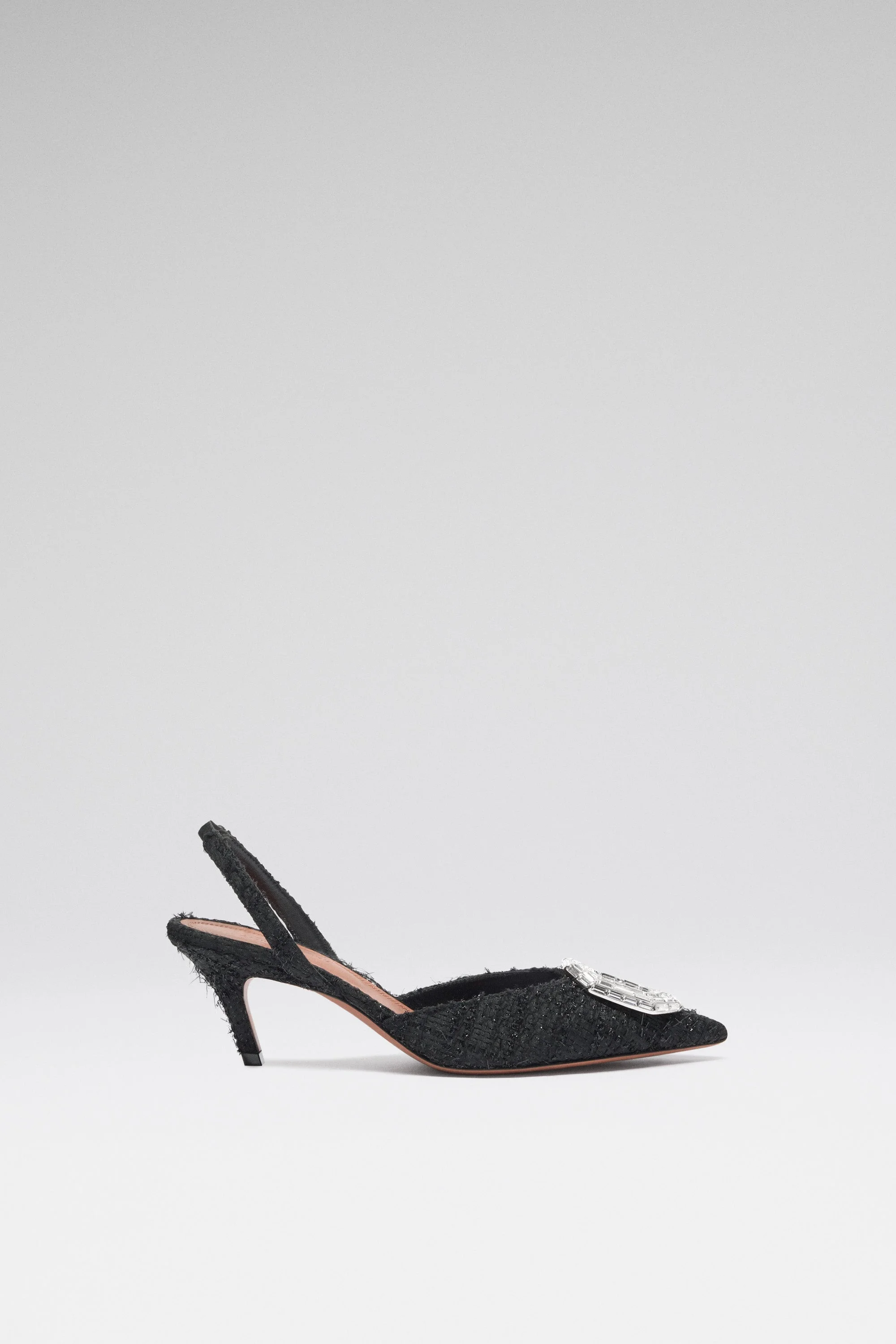 Camelia Sling 60 Black Tweed - 60MM KITTEN HEEL - Rectangular mirrored accessory - pointed toe - Fits true to size Composition - Upper: 100% fab - Lining: 100% goat - Sole: 70% Leather and 30% Rubber Origin Made in Italy