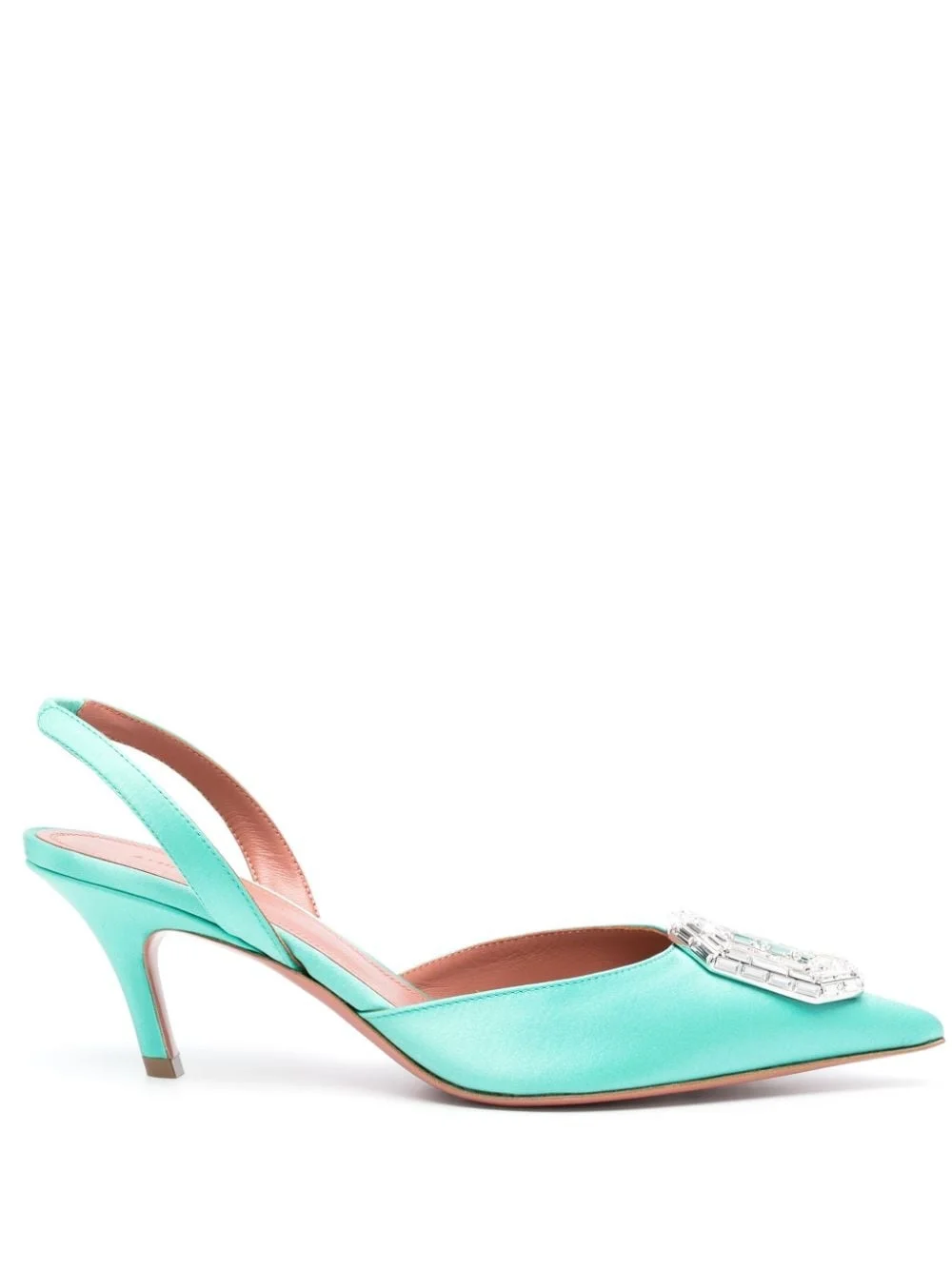 Camelia 60mm slingback pumps Amina Muaddi is renowned for presenting elegant footwear, as seen with these Camelia 60mm slingback pumps. The pair offers a daring look thanks to the crystal embellishment at the toe. Highlights - Aqua green - Satin finish - Pointed toe - Crystal embellishment - Slingback strap Made in Italy Composition Outer: Fabric 100% Lining: Calf Leather 100% Sole: Calf Leather 100%, Rubber 100% SIZE & FIT Measurement HEEL 2.95 in(7.5 cm) Sole height 0.39 in(1 cm)