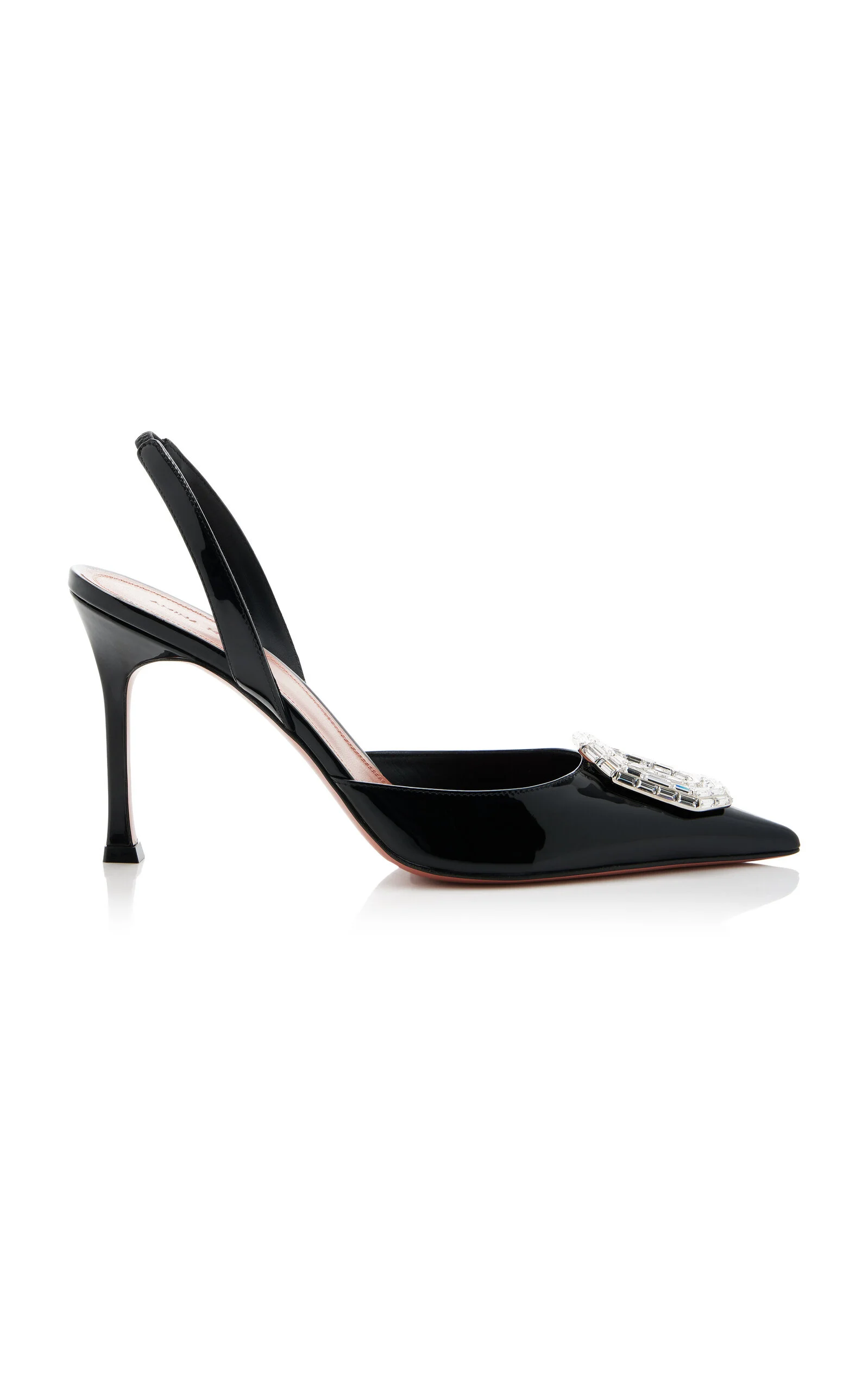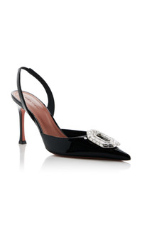 Well-crafted and unambiguously glamorous, Amina Muaddi's accessories are in high demand by international taste-makers. The brand is synonymous with vibrant hues, luxurious embellishments, and metallic shine all while being exquisitely designed to last well after the party. Meticulously crafted in Italy, the 'Camelia' slingbacks have a pointed-toe silhouette made from glossy patent leather topped with a crystal brooch. PRODUCT DETAILS - Heel measures approximately 90mm/ 3.5" - Slip on - Composition: patent leather - Made in Italy