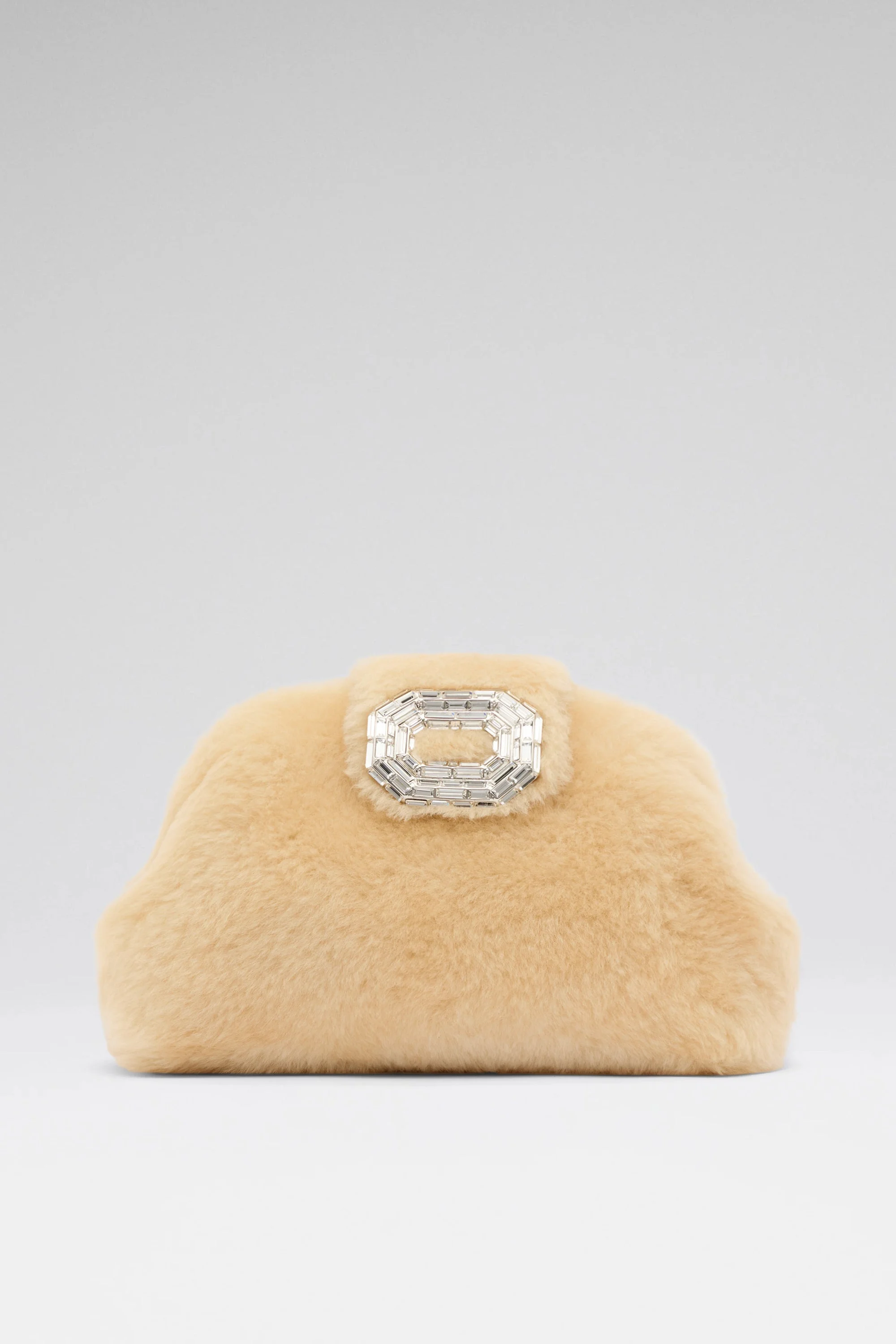 Camelia Clutch Beige Shearling - L 21cm x W 9cm x H 11cm - Signature Buckle Strap - Internal flat pocket - Magnetic closure - Cross Body Chain With Foldable Links - Dust Bag and Box Included Composition - External: 90% Lambskin and 10% Crystals - Internal: 100% Lambskin - Hardware: 100% Brass Origin Made in Italy