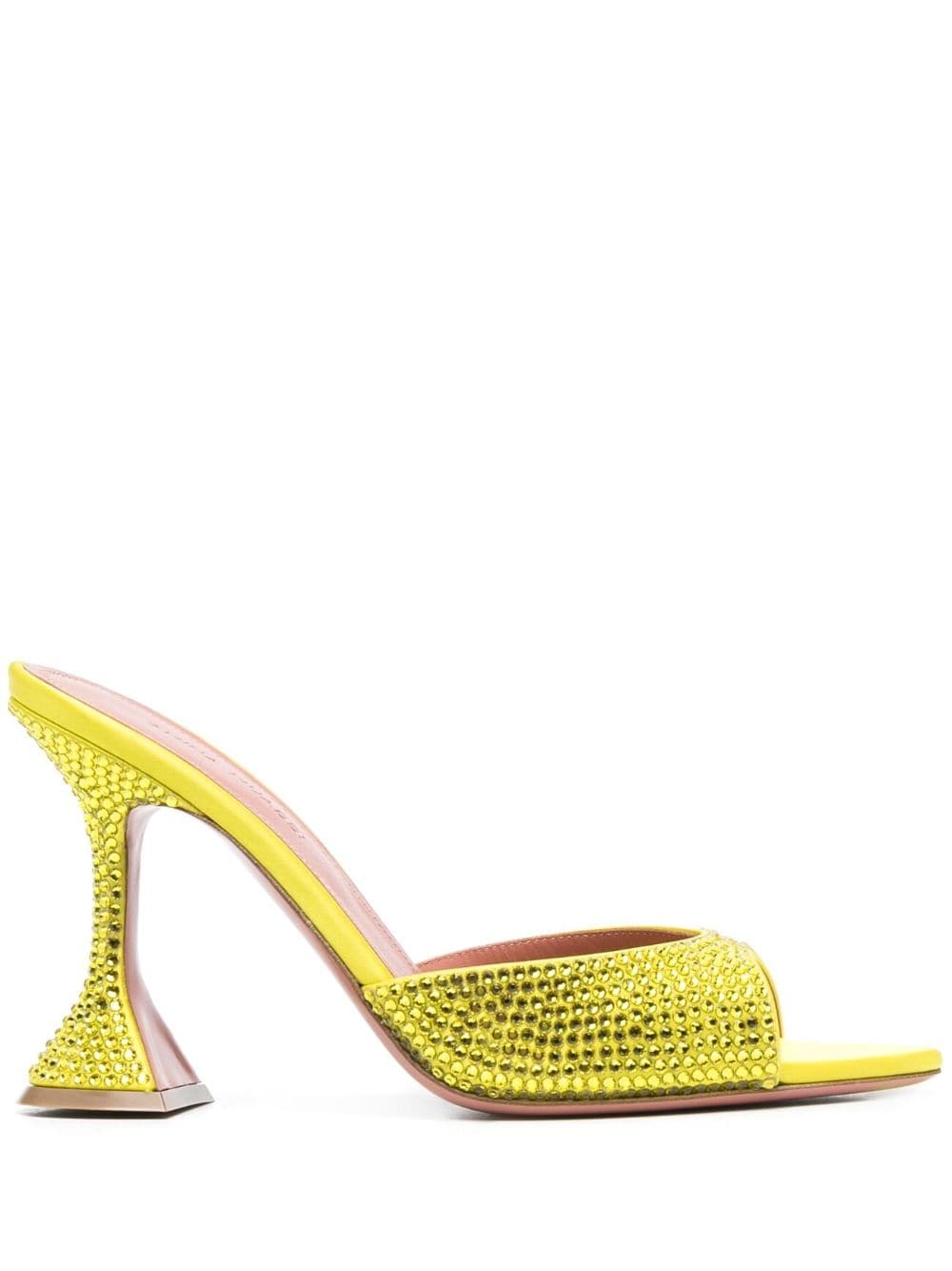 Caroline 95mm crystal-embellished mules These Amina Muaddi Caroline mules are instantly recognisable by their signature flared heels and scores of tonal crystal embellishments. Theyâre crafted from lustrous satin in a vibrant yellow hue with sleek pointed toes that enhance their sculptural bent. Highlights - Citron yellow - Satin - Crystal embellishment - Pointed toe - Open toe - High sculpted heel - Branded footbed Composition Outer: glass 100%, Fabric 100% Lining: Fabric 100%, Calf Leather 100% Sole: Calf Leather 100%, Rubber 100% SIZE & FIT Measurement HEEL 3.7 in(9.5 cm)