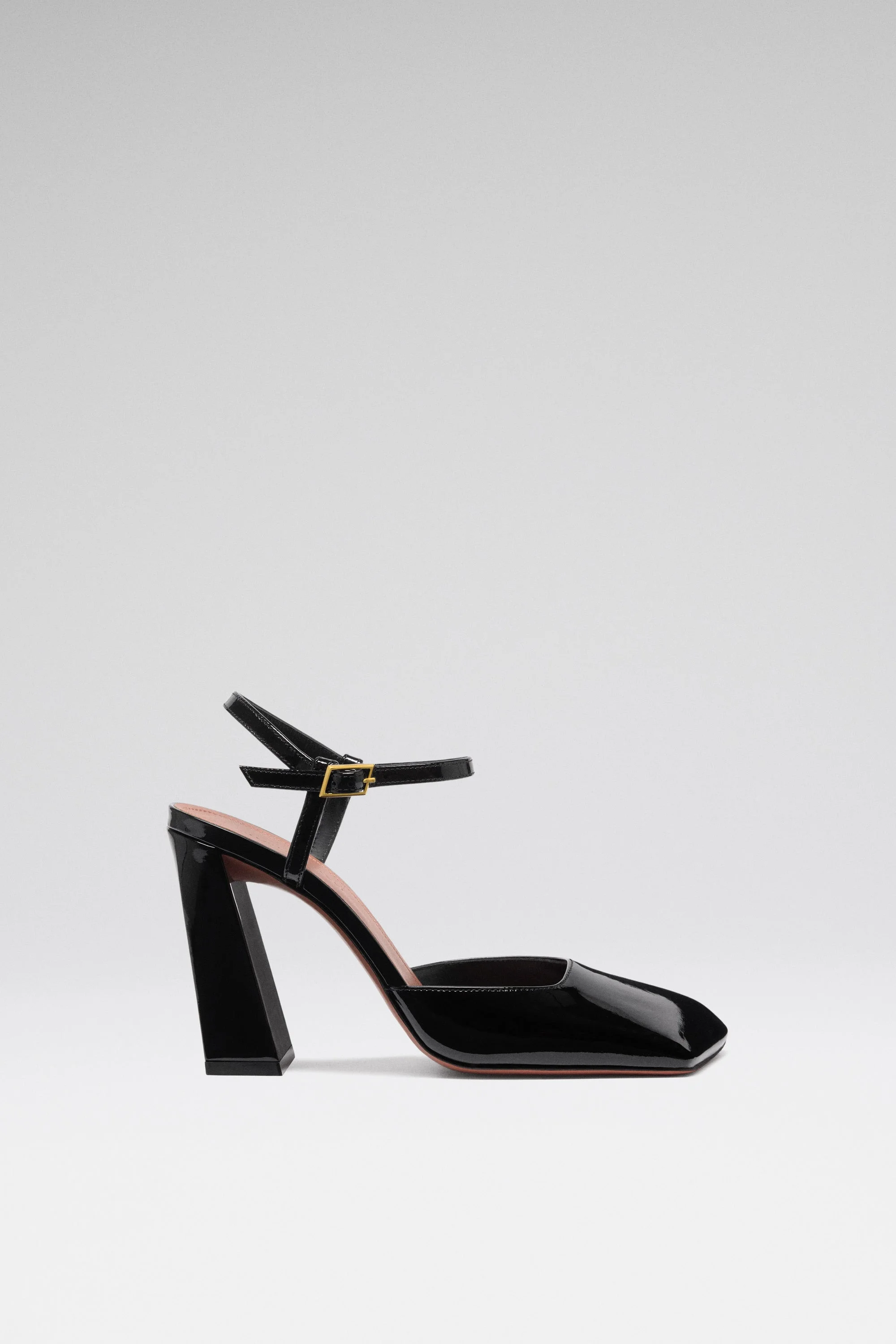 Charlotte Pump Black Patent and Gold Buckle - 95mm Block Heel - Silver buckle - Squared oblique toe - Fits true to size Composition - Upper: 100% CALF - Lining: 100% GOAT - Sole: 70% Leather and 30% Rubber Origin Made in Italy