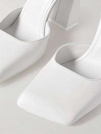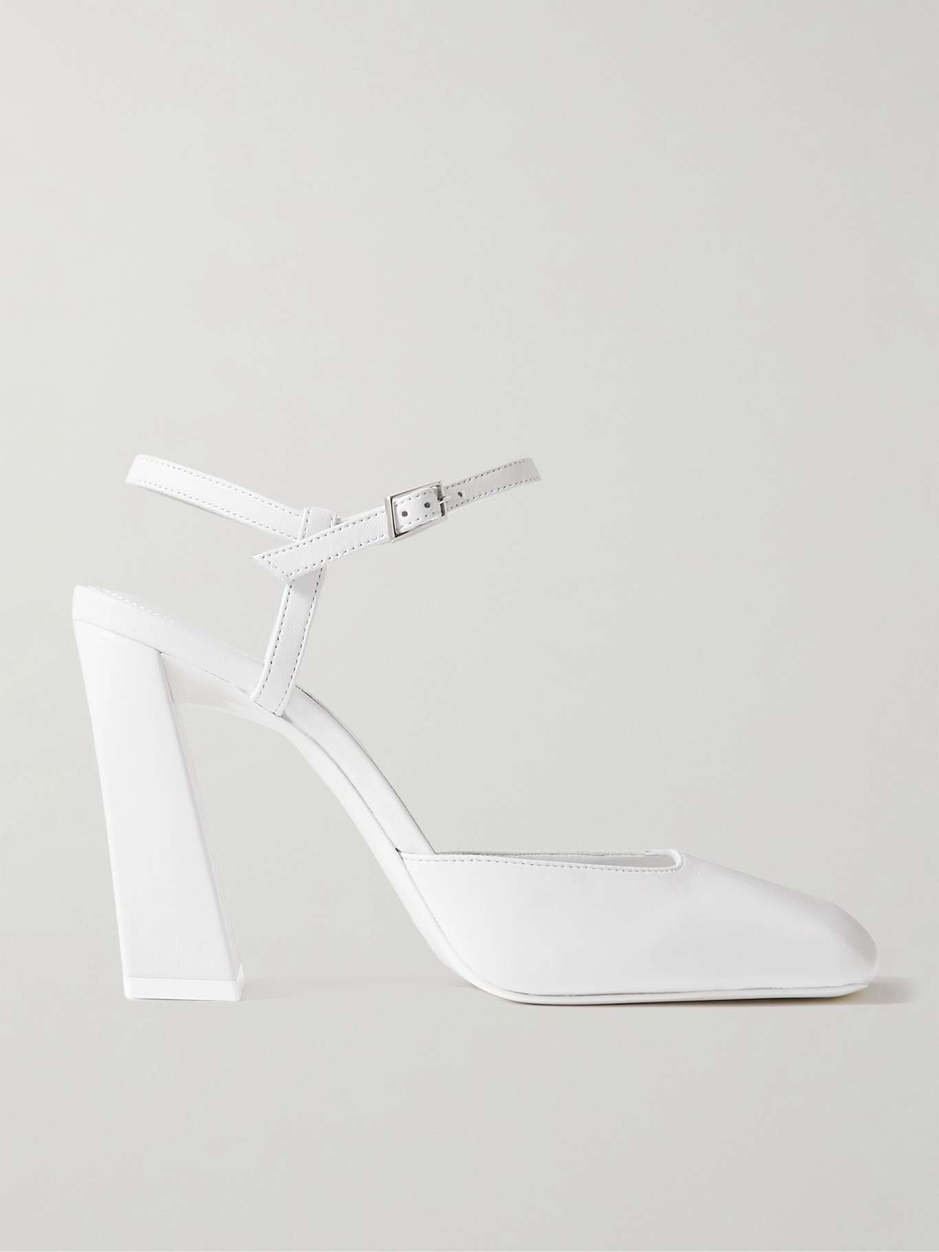 EDITORS'NOTES Amina Muaddi's 'Charlotte' pumps seem classic at first glance, but the slanted toes and block heels make them feel so modern. Skilfully crafted in Italy from supple leather, they look just as glamorous with jeans and a romantic top as they do with mini dresses and skirts. SIZE & FIT - Fits true to size, take your normal size - Italian sizing DETAILS & CARE - Heel measures approximately 95mm/ 4 inches - White leather (Lamb) - Buckle-fastening ankle strap
