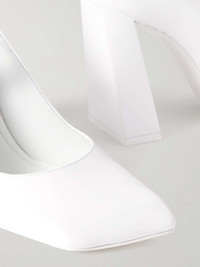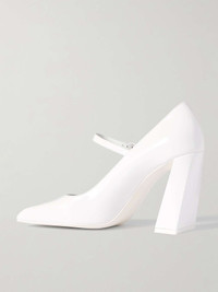 EDITORS'NOTES This season's trending Mary Jane pumps are clean and contemporary in the hands of Amina Muaddi. Crafted in Italy from patent-leather, they have angular toes that are mirrored by the slanted block heels and buckles. SIZE & FIT - Fits true to size, take your normal size - Italian sizing DETAILS & CARE - Heel measures approximately 95mm/ 4 inches - White patent-leather (Calf) - Buckle-fastening strap