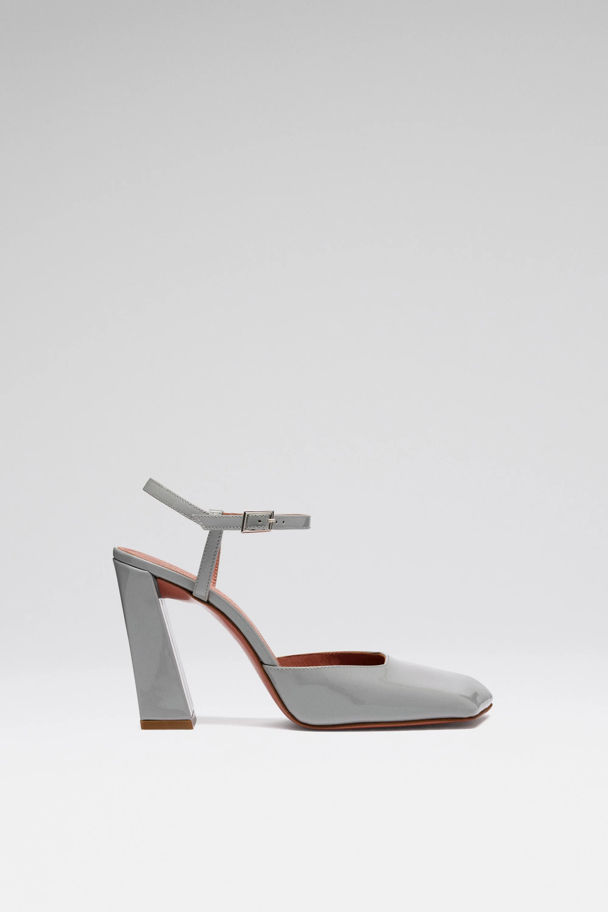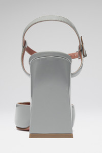 Charlotte Pump 95 Steel Patent - 95MM BLOCK HEEL - Silver buckle - Squared oblique toe design - Fits true to size Composition - Upper: 100% CALFSKIN - Lining: 100% GOATSKIN - Sole: 70% GOATSKIN AND 30% RUBBER Origin Made in Italy
