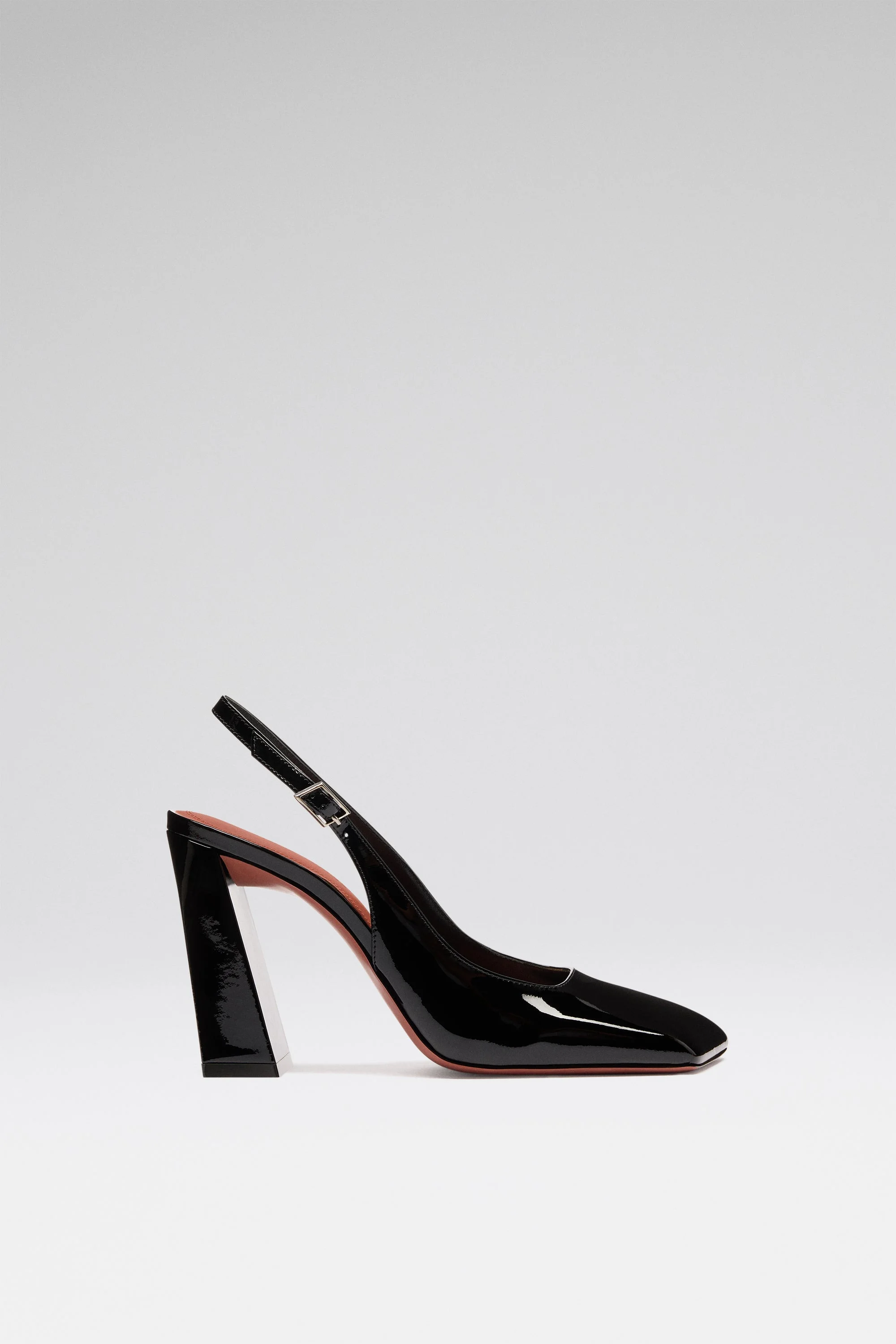 Charlotte Sling Black Patent - 95mm Block Heel - Silver buckle - Squared oblique toe - Fits true to size Composition - Upper: 100% CALF - Lining: 100% Goat - Sole: 70% Leather and 30% Rubber Origin Made in Italy