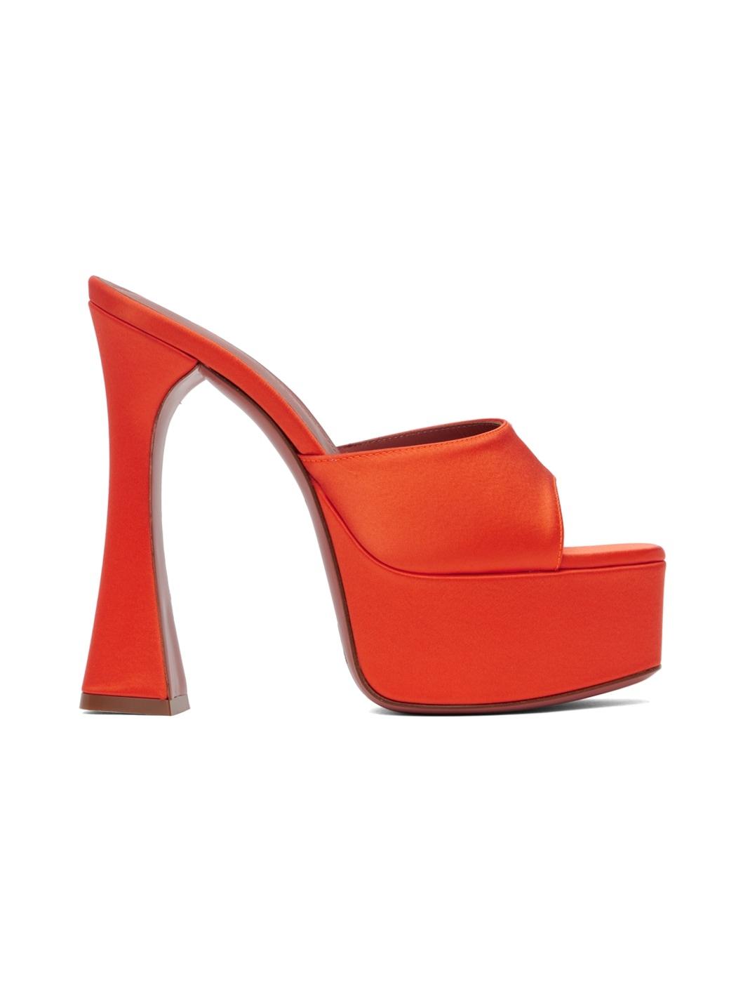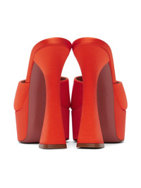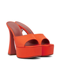 Satin slip-on heeled sandals in orange. · Open square toe · Logo embossed at buffed leather footbed · Covered platform midsole · Covered heel with rubber injection · Leather sole · Platform: H1.5 in · Heel: H5.5 in Supplier color: Orange