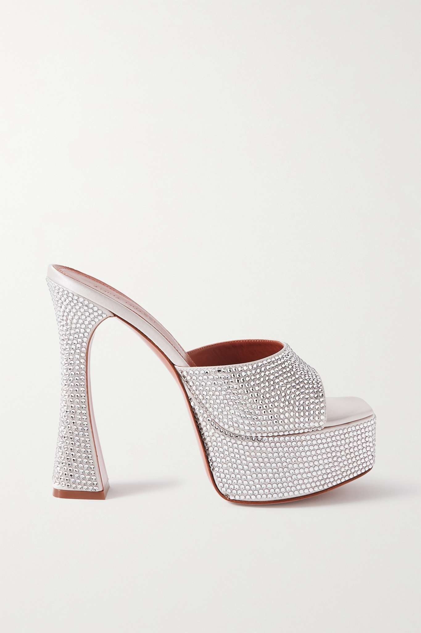 EDITORS'NOTES Amina Muaddi believes shoes "are the most powerful items in fashion," which shows through in the stratospheric shape of these 'Dalida' sandals. Sculpted from satin with twinkly crystals, they're set on stacked platform soles and the brand's signature curved heels. SIZE & FIT - Fits true to size, take your normal size - Italian sizing DETAILS & CARE - Heel measures approximately 140mm/ 5.5 inches with a 45mm/ 2 inch platform - Silver satin - Slip on