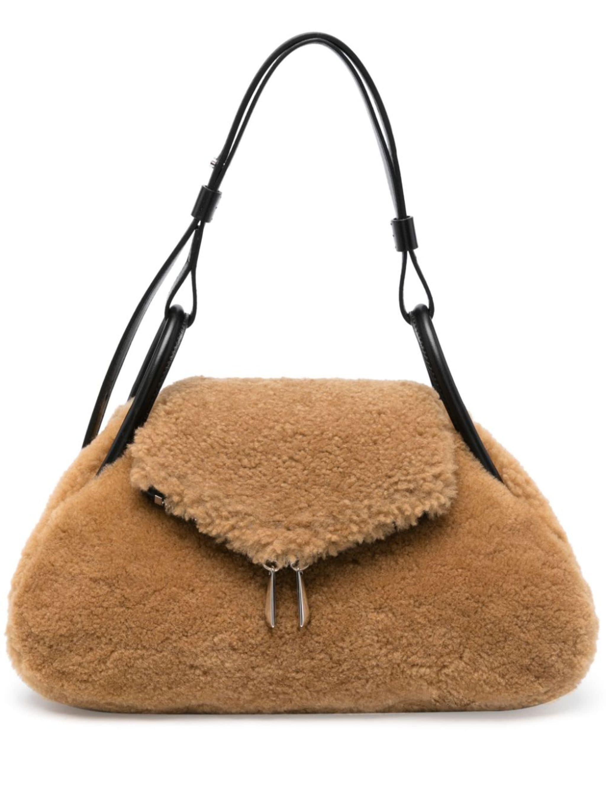 caramel brown shearling, calf leather hard trapeze body adjustable top handle zip-fastening pocket AM signature zip pullers main compartment internal patch pocket internal logo stamp full lining silver-tone hardware foldover top This piece comes complete with a protective dust bag. Size & Fit Model Measurements: Bust: 84cm Height: 178cm Hips: 91cm Waist: 66cm DEPTH: 22cm HANDLE: 22cm HEIGHT: 19cm STRAP: 38cm WIDTH: 33cm Fabric and Care Designer Style ID: GEMINI Designer Colour: SHEARLING LATTE Composition: Outer: Sheep skin/shearling 100%, Calf leather 100%Made in Italy