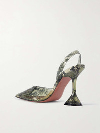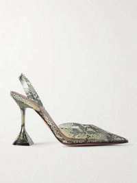 Unexpected fabrications and signature details mean Amina Muaddi's 'Holli' pumps are like objets d'art. This pair is made from snake-effect PVC that glistens from all angles and is set on the designer's trademark pyramid heel. Consider hemlines carefully so the low-cut vamp and sharp point toe remains in focus. Size & Fit - Fits small to size, take a half size larger than normal - Italian sizing Details & Care - Heel measures approximately 95mm/ 4 inches - Green PVC - Slingback strap Small to size. See Size & Fit notes.
