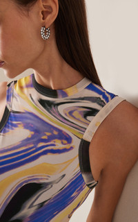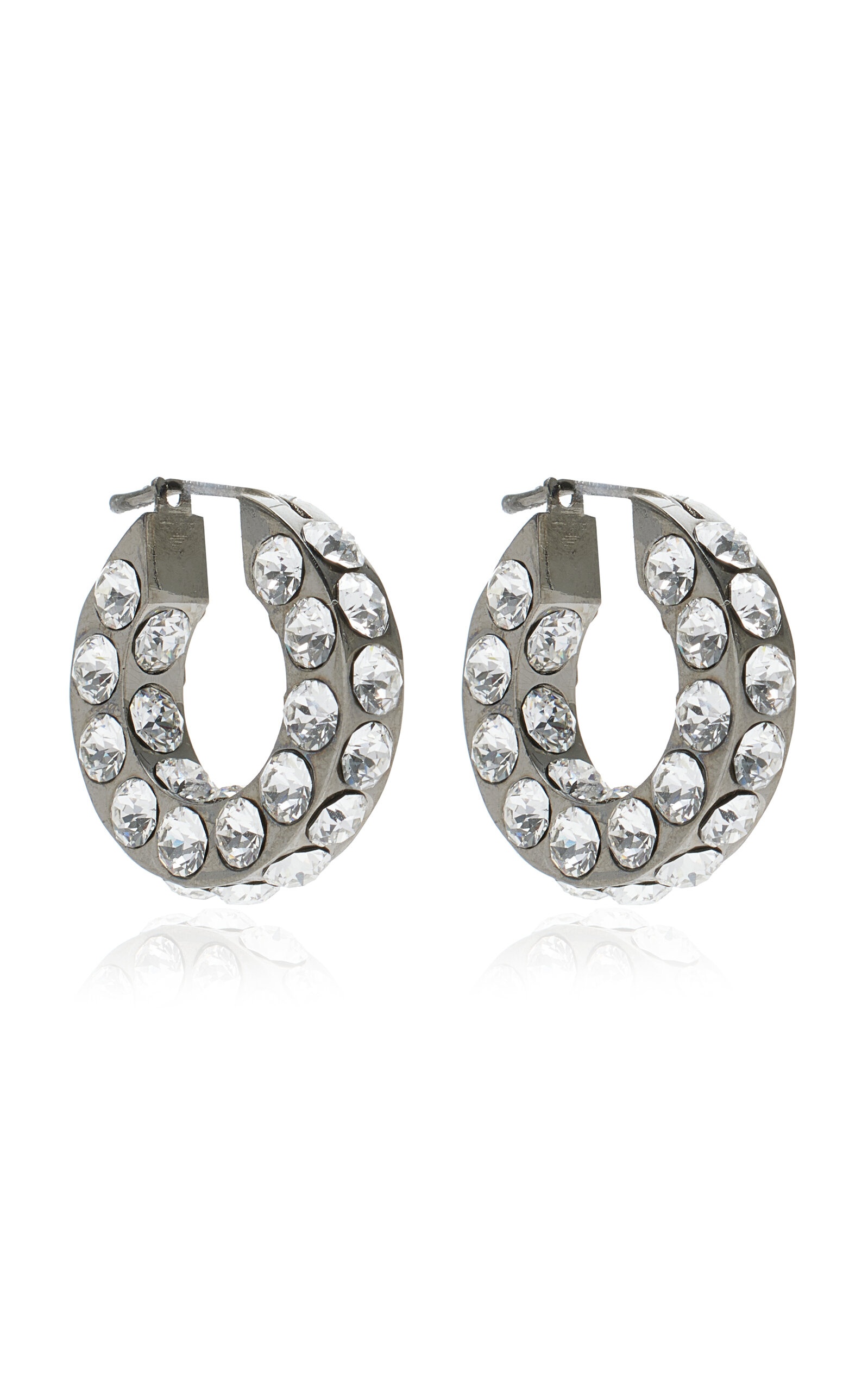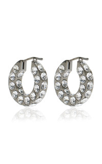 Well-crafted and unambiguously glamorous, Amina Muaddi's jewels and accessories are in high demand by international tastemakers. The brand is synonymous with vibrant hues, luxurious embellishments, and metallic shine all while being exquisitely designed to last well after the party. Cast from silver-toned bronze, the 'Jahleel' earrings have thick lobe-hugging hoops set with rows of crystals at every angle. PRODUCT DETAILS - Post fastening for pierced ears - Composition: 85% bronze, 15% strass - Made in Italy