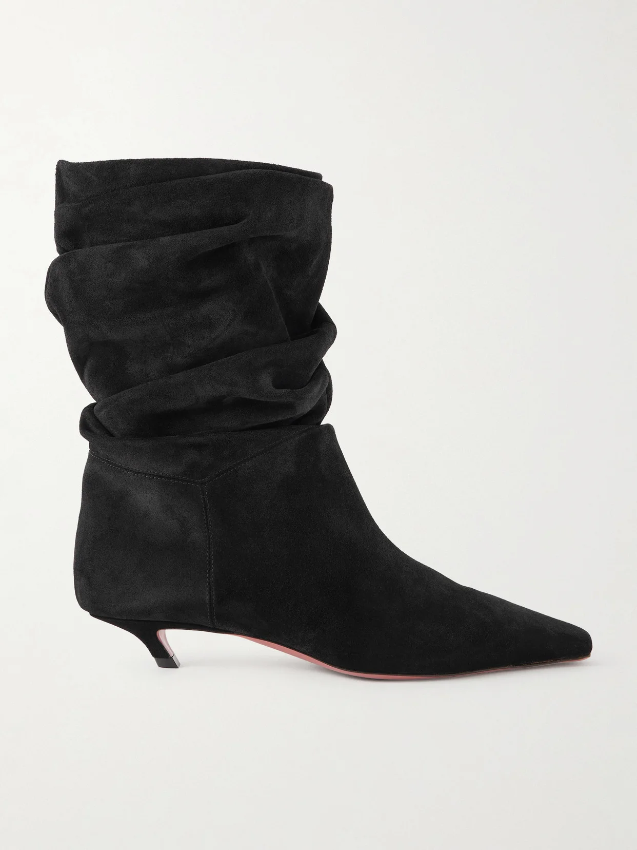 Amina Muaddi's 'Jamie' boots are ruched along the calves for an effortless feel. Crafted in Italy from suede, they have elongated pointed toes and rest on kitten heels that offer 25mm of subtle lift. Show yours off with cropped hemlines.