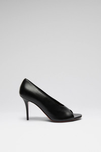 Julianne Peep Toe Pump Black Nappa - 95mm Heel - Slip-on design - Almond oblique peep toe - Fits true to size Composition - Upper: 100% Lambskin - Lining: 100% Goatskin - Sole: 70% Leather and 30% TPU Origin Made in Italy