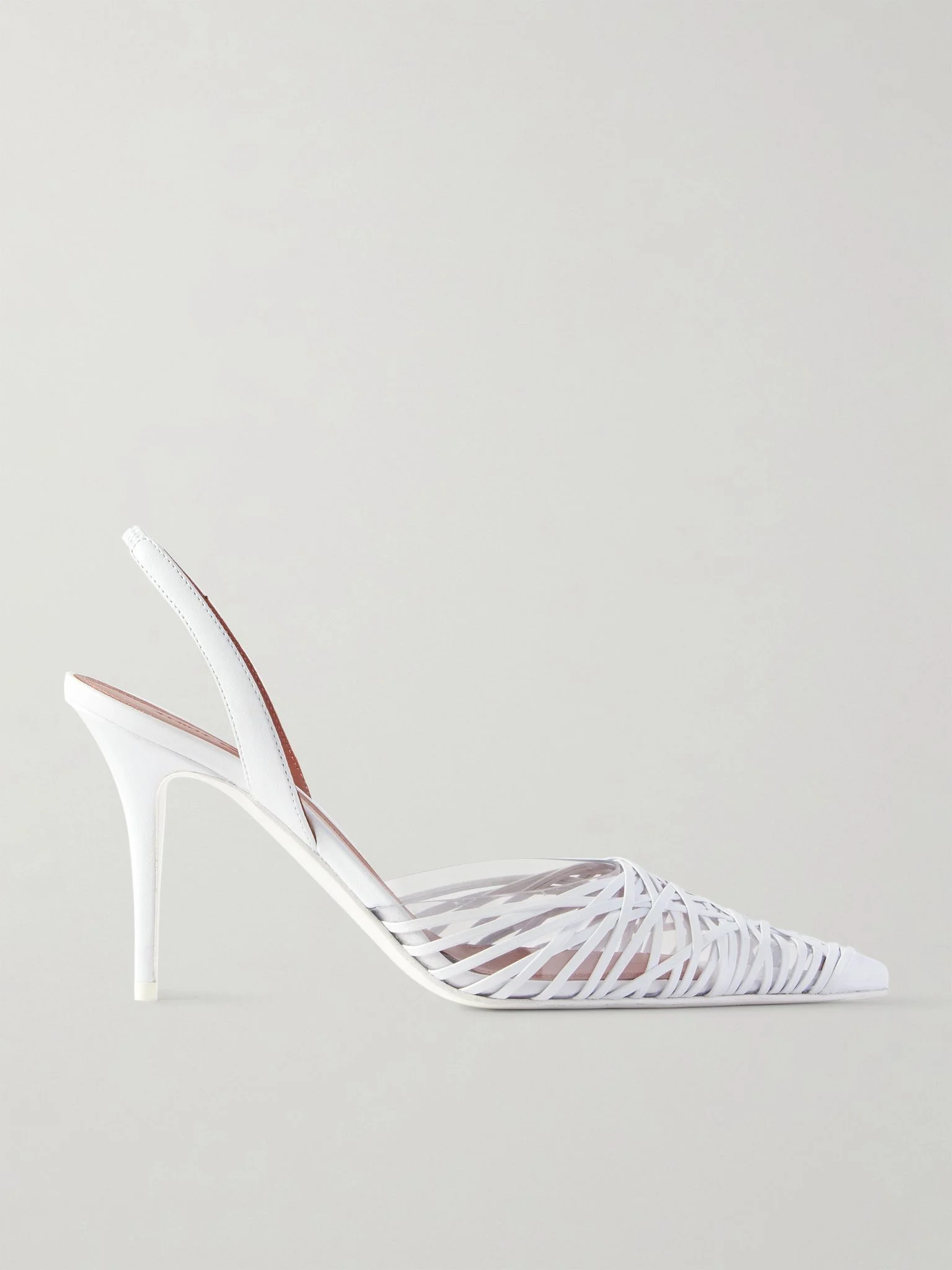 Amina Muaddi's elegant shoes add a glamorous touch to evening looks. Crafted in Italy from clear PVC, these 'Lori' pumps have pointed toes detailed with slim strips of leather that create a cage-like design. Size & Fit - Fits true to size, take your normal size - Italian sizing Details & Care - Heel measures approximately 90mm/ 3.5 inches - White leather (Lamb), clear PVC - Elasticated slingback strap