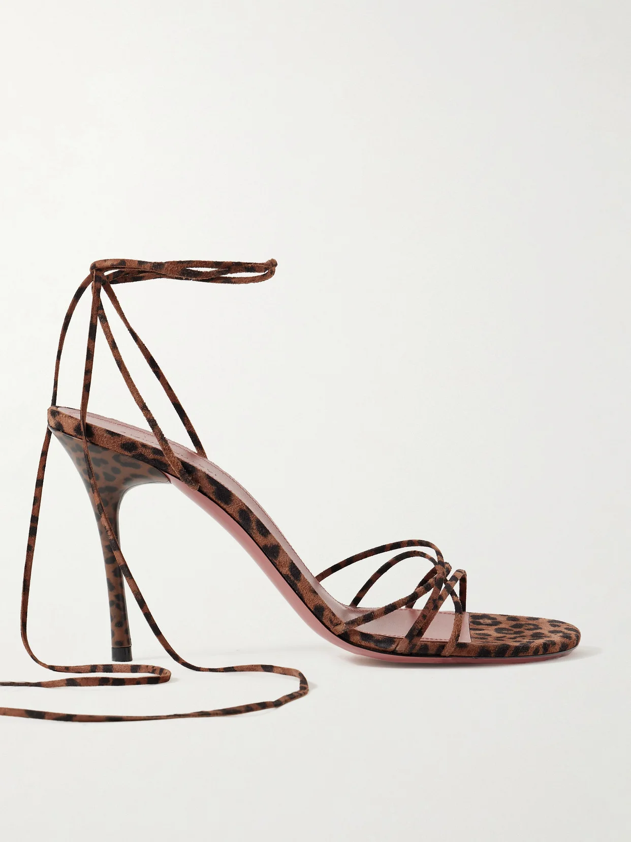 Amina Muaddi's 'Lori' sandals have slim straps that elegantly wrap around the ankles. They've been crafted in Italy from leopard-print suede and rest on stiletto heels that offer 95mm of lift. Small to size. See Size & Fit notes.