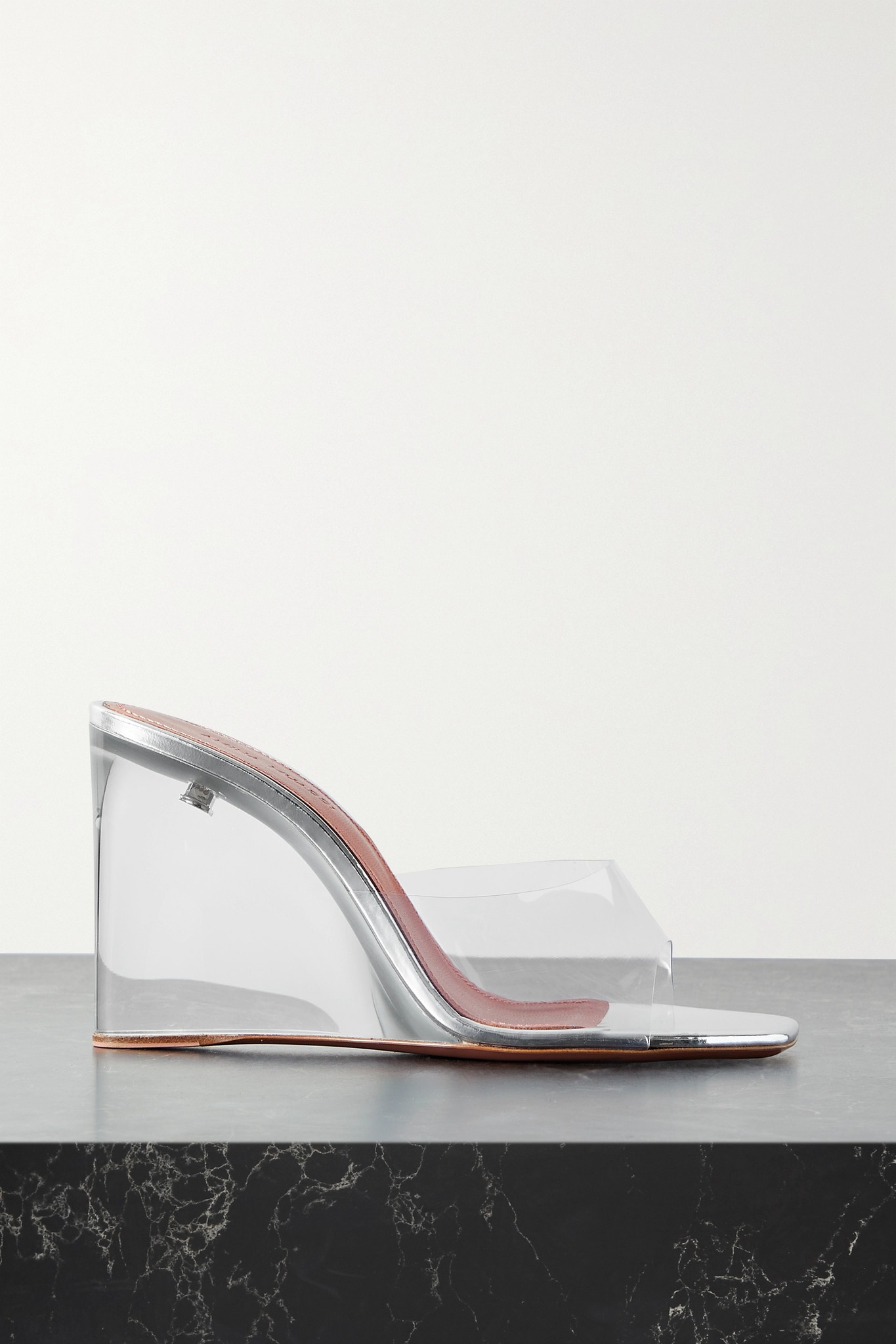 EDITORS'NOTES Amina Muaddi believes there's no better confidence booster than eye-catching shoes. An update on the original 'Lupita' style, these mules have silver leather soles and are set on a clear wedge heel with a matching PVC strap. Keep them in focus with a bright pedicure. SIZE & FIT - Fits true to size, take your normal size - Those with wide feet may wish to take the next half size up - Italian sizing DETAILS & CARE - Wedge heel measures approximately 95mm/ 4 inches -Clear PVC - Slip on