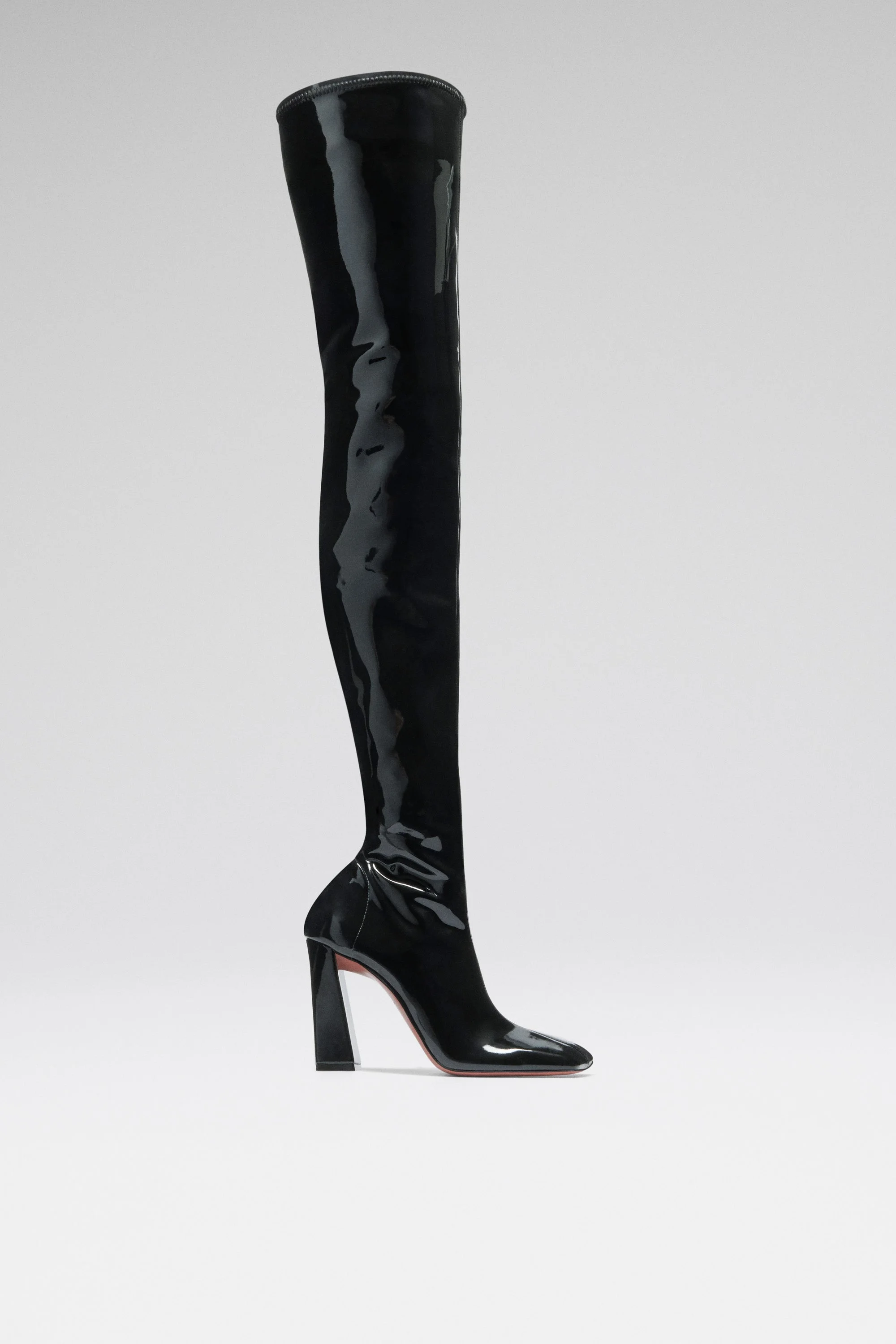 Marine Stretch Thigh High Boot Black Stretch Latex - 95MM BLOCK HEEL - Thigh High Length - Squared oblique toe - Fits true to size Composition - Upper: 100% Latex - Lining: 100% Goat - Sole: 70% Leather and 30% Rubber Origin Made in Italy