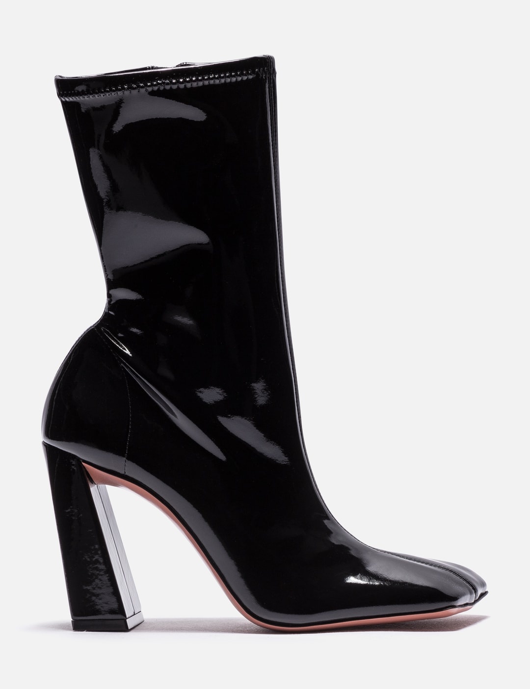 - Amina Muaddi - Marine Stretch Bootie - Ankle height - Stretch fit - Latex upper - Squared oblique toe design - Lambskin and goatskin lining - Zip closure - 95mm block heel - Leather outsole - Rubber heel cap - Fits true to size - Made in Italy - Color: Black Latex - Material: Upper: 40% Polyester, 14% Cotton, 46% Polyamid ; Lining: 79% Lambskin And 21% Goatskin ; Sole: 70% Leathe, 30% Rubber - See more Boots and Shoes