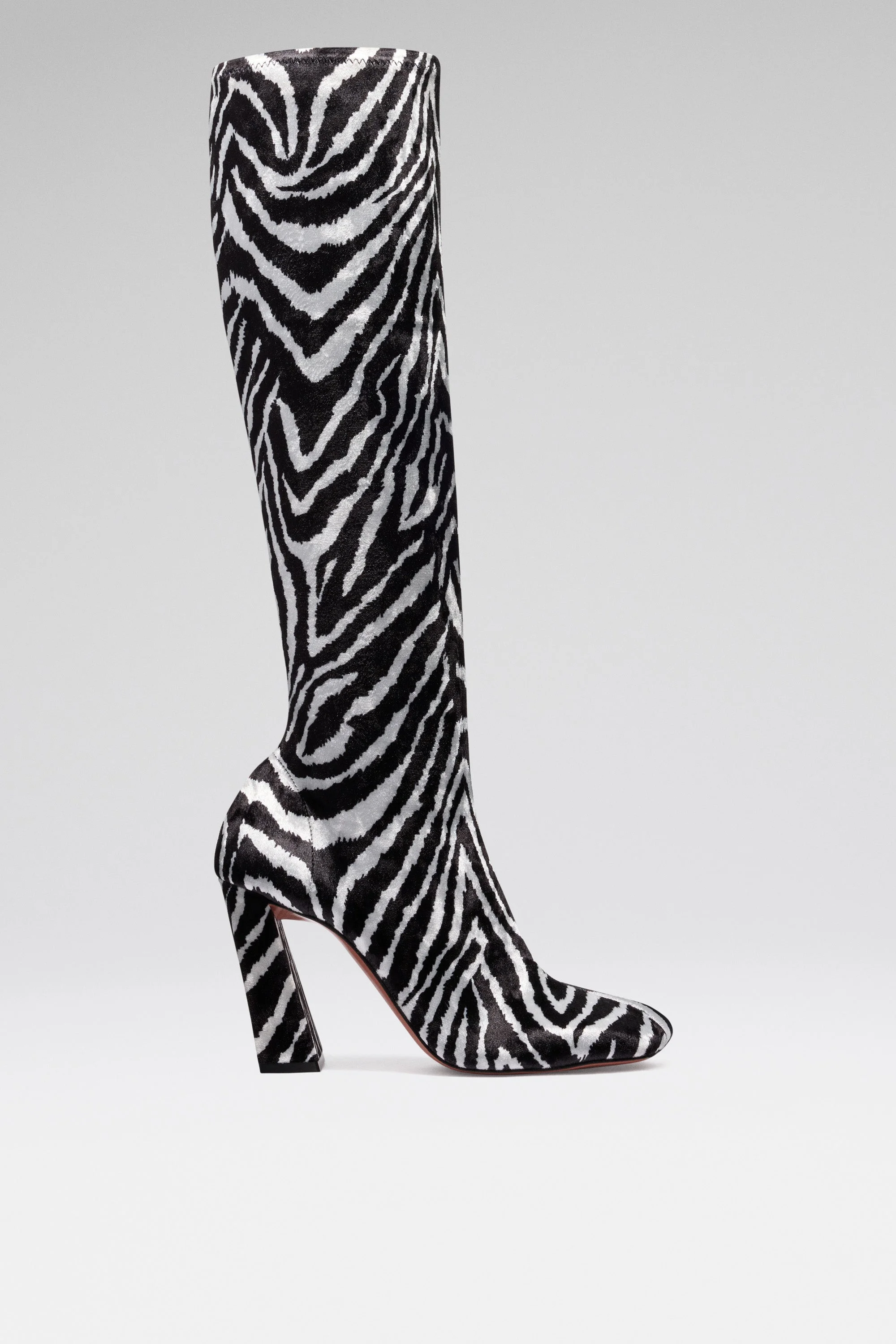 Marine Stretch Boot Stretch Zebra Velvet - 95MM BLOCK HEEL - Below the knee - Squared oblique toe design - Stretch fit - Zip closure - Fits true to size Composition - Upper: 96% POLYESTER AND 4% SPANDEX - Lining: 78% LAMBSKIN AND 22% GOATSKIN - Sole: 70% LEATHER AND 30% RUBBER Origin Made in Italy