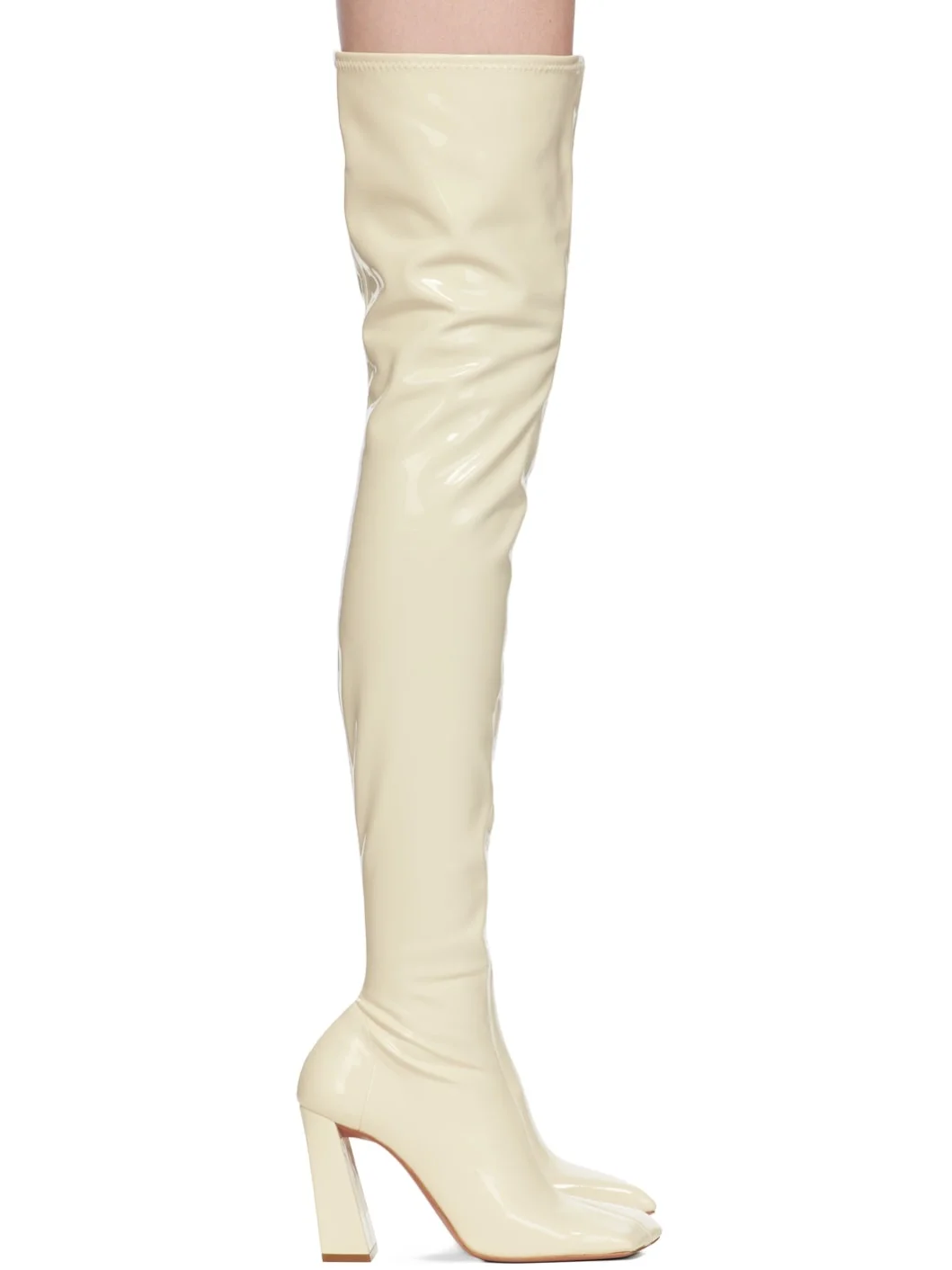 Thigh-high latex boots in off-white. · Square toe · Zip closure at inner side · Bonded brushed jersey lining · Covered block heel · Leather sole with rubber injection · Heel: H4" Supplier color: Almond Upper: latex. Sole: leather, rubber. Made in Italy 241415F115005