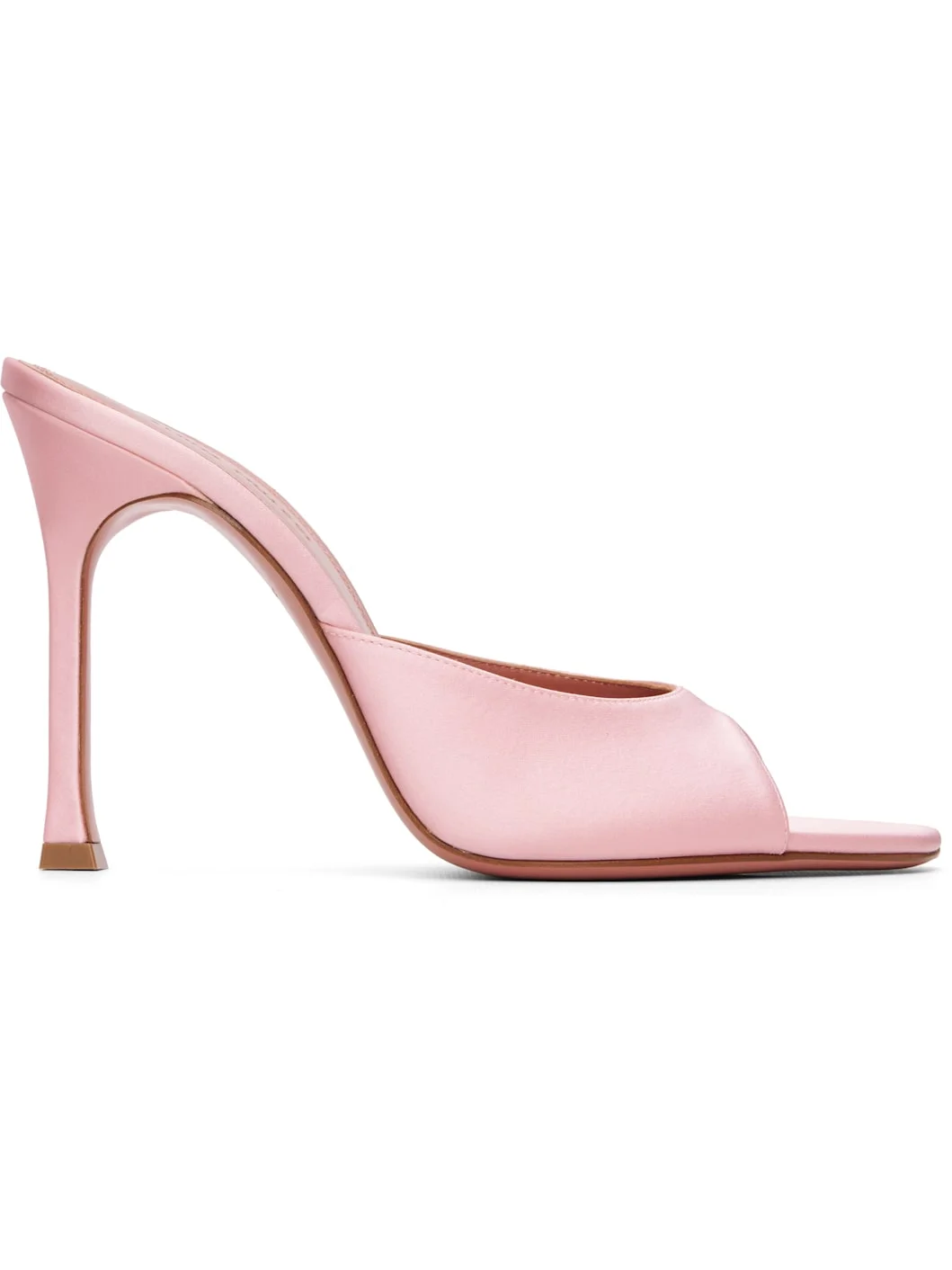 Satin heeled sandals. · Open square toe · Logo embossed at leather footbed · Stiletto heel · Leather sole with rubber injection · Heel: H4" Supplier color: Baby Pink Satin Upper: textile. Sole: leather, rubber. Made in Italy 261415F125032