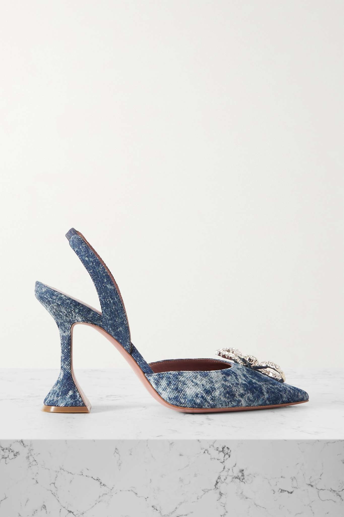 EDITORS'NOTES Amina Muaddi's designs are often associated with <i>objects d'art</i>, and admired up close, these 'Rosie' slingback pumps are a testament to the comparison. They've been made in Italy from acid-washed denim with crystal bow embellishments and rest on the brand's sculptural fluted heels. SIZE & FIT - Fits true to size, take your normal size - Italian sizing DETAILS & CARE - Heel measures approximately 95mm/ 4 inches - Tonal-blue denim - Elasticated slingback strap - Designer color: Denim Acid