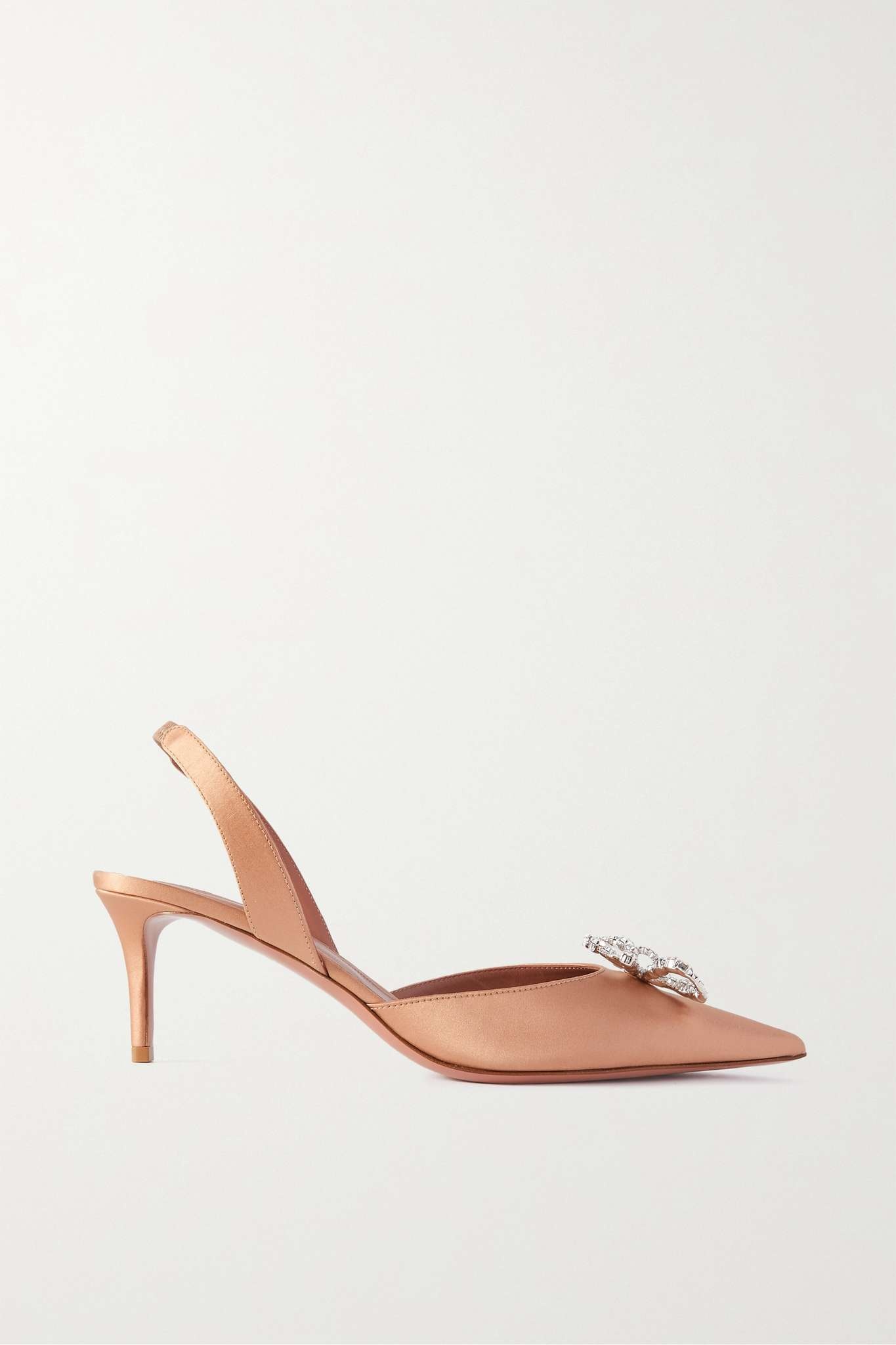 EDITORS'NOTES Amina Muaddi's 'Rosie' pumps are proof that a small detail can make a big difference. They're crafted from lustrous satin with smooth leather linings and topped with crystal-embellished bows. SIZE & FIT - Fits true to size, take your normal size - Italian sizing DETAILS & CARE - Heel measures approximately 60mm/ 2.5 inches - Antique-rose satin - Elasticated slingback strap - Designer color: Latte