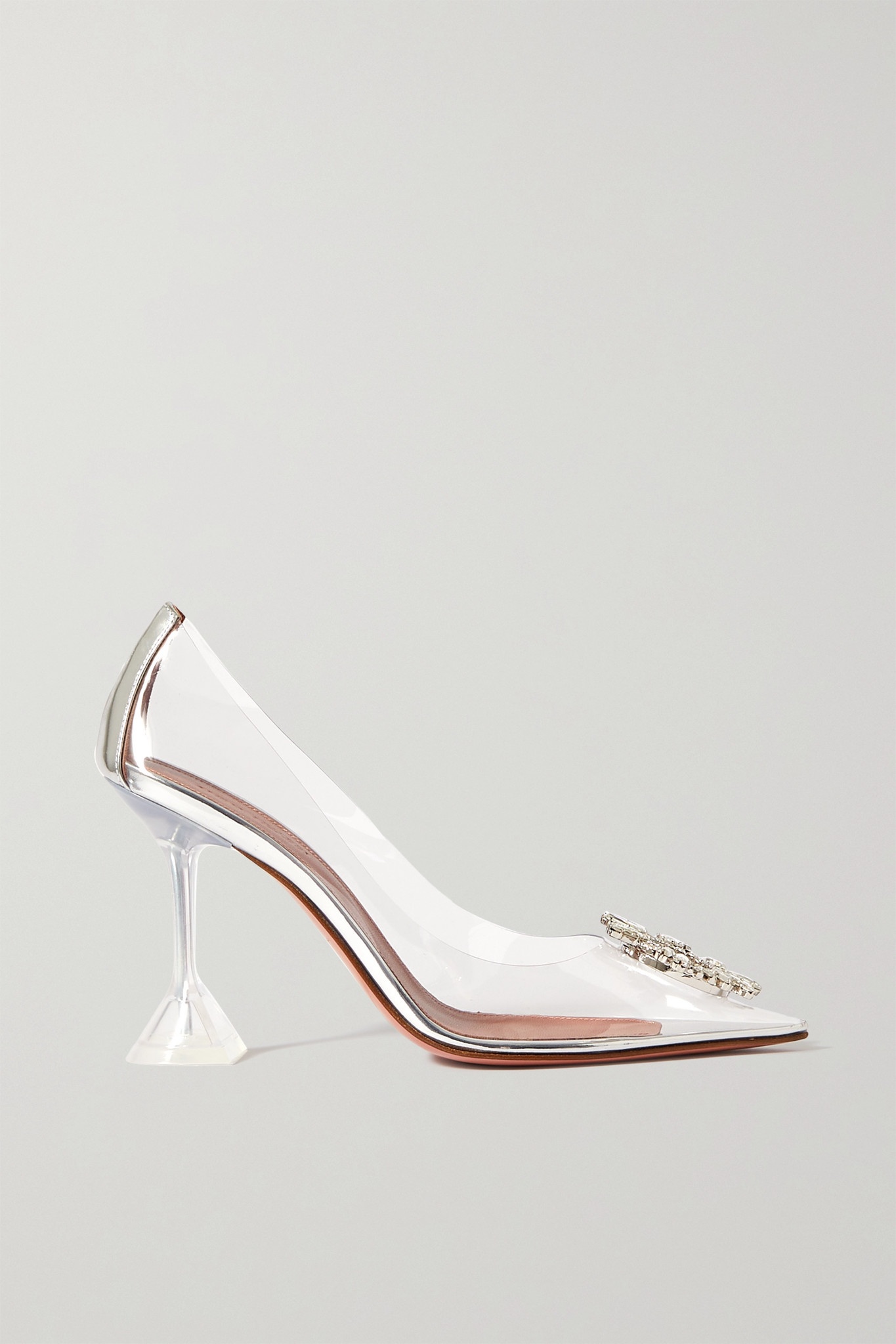 EDITORS'NOTES We can't guarantee Amina Muaddi's 'Begum' pumps will enchant Prince Charming, but you'll look every bit as magical as Cinderella when you slip them on. Made in Italy from clear and silver PVC, they're each embellished with a glistening crystal brooch and rest on a signature fluted heel. The sleek pointed toes will lengthen your legs. SIZE & FIT - Fits true to size, take your normal size - Italian sizing DETAILS & CARE - Heel measures approximately 95mm/ 4 inches - Clear and silver PVC - Slip on - Made in Italy