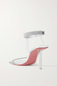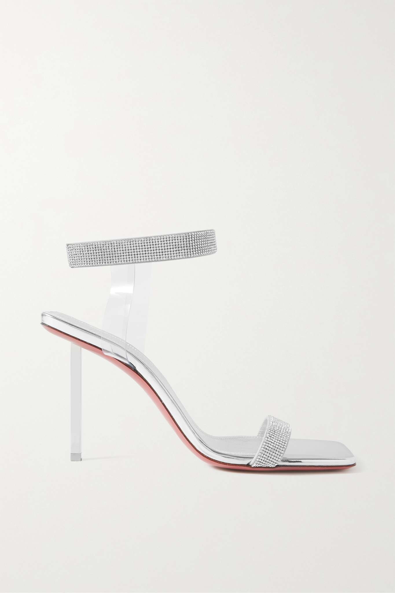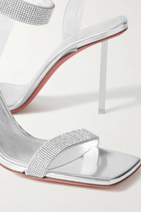 EDITORS'NOTES Amina Muaddi's footwear is all about the glamour. These 'Rih' sandals have suede straps embellished with rows of sparkling crystals - the ones at the ankles are secured with clear PVC strips and look as if they're floating. The mirrored-leather and pin-thin heels add a final dose of drama. SIZE & FIT - Fits true to size, take your normal size - Italian sizing DETAILS & CARE - Heel measures approximately 85mm/ 3.5 inches - Silver mirrored-leather (Goat), clear PVC, silver suede - Slips on - Designer color: Silver Mirror