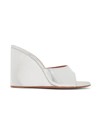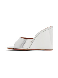 Buffed leather heeled sandals in metallic silver tone. · Open square toe · Logo-embossed padded footbed · Covered wedge heel · Leather sole with rubber injection · Heel: H3.75" Supplier color: Silver Upper: leather. Sole: leather, rubber. Made in Italy 241415F125009