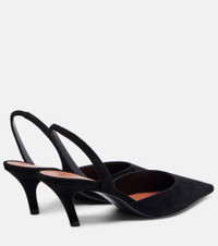 Amina Muaddi has quickly become a fashionable favorite thanks to its eye-catching and sculptural shoes. Crafted from velvety suede, the Sofia slingback pumps sit atop 60mm heels and feature sleek pointed toes and elasticated straps. Product Details - Upper: goat leather (suede) - Lining: leather - Sole: leather insole, leather and rubber sole - Toe shape: pointed toe - Made in Italy - Includes: shoe box, dust bag - Designer color name: Black - Item color: black - Item number: P01098802 Size & Fit - True to size - European sizes - 6cm-2.5" heel (size EU 38)