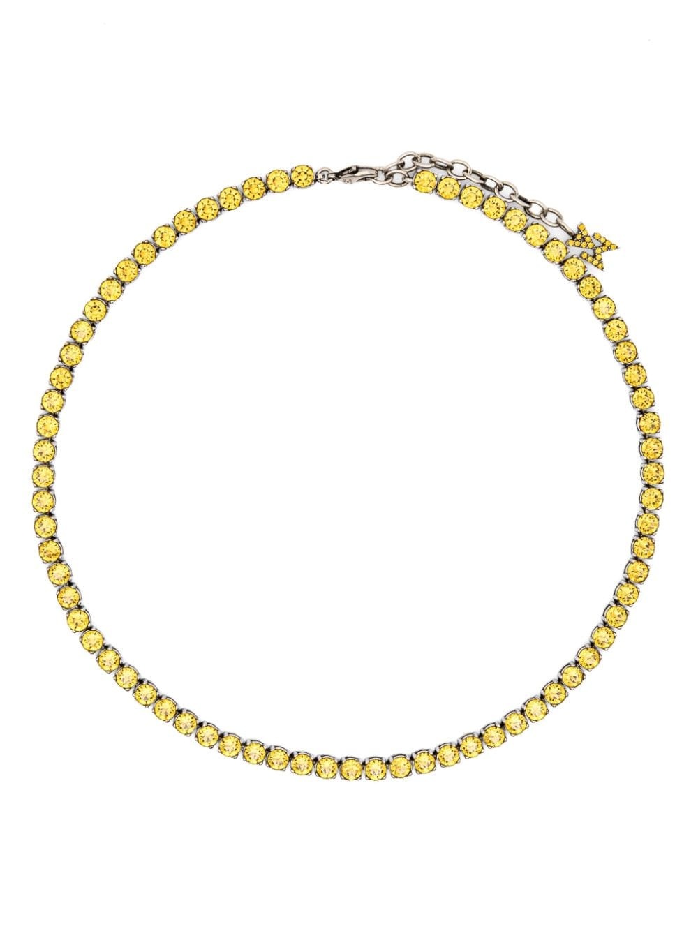 Tennis crystal-embellished necklace Highlights - Silver-tone/yellow - Brass - Crystal embellishment - Logo charm - Lobster claw fastening Imported SIZE & FIT Model measurements Height 5 ft 10 in(1.79 m) Bust/Chest 33.07 in(84 cm) Hips 35.82 in(91 cm) Waist 24.4 in(62 cm) Measurement Length when open 15.35 in(39 cm) Minimum Length 13.77 in(35 cm) WIDTH 0.11 in(0.3 cm)