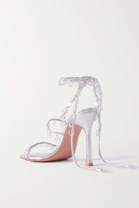 EDITORS'NOTES The slim ties on Amina Muaddi's 'Tina' sandals wrap so beautifully around the ankles. They're crafted from silver leather and embellished with crystal charms that adorn your feet like jewelry. Go bold with your other accessories and team them with the coordinating choker in our edit. SIZE & FIT - Fits true to size, take your normal size - Italian sizing DETAILS & CARE - Heel measures approximately 105mm/ 4 inches - Silver leather (Calf) - Ties at ankle