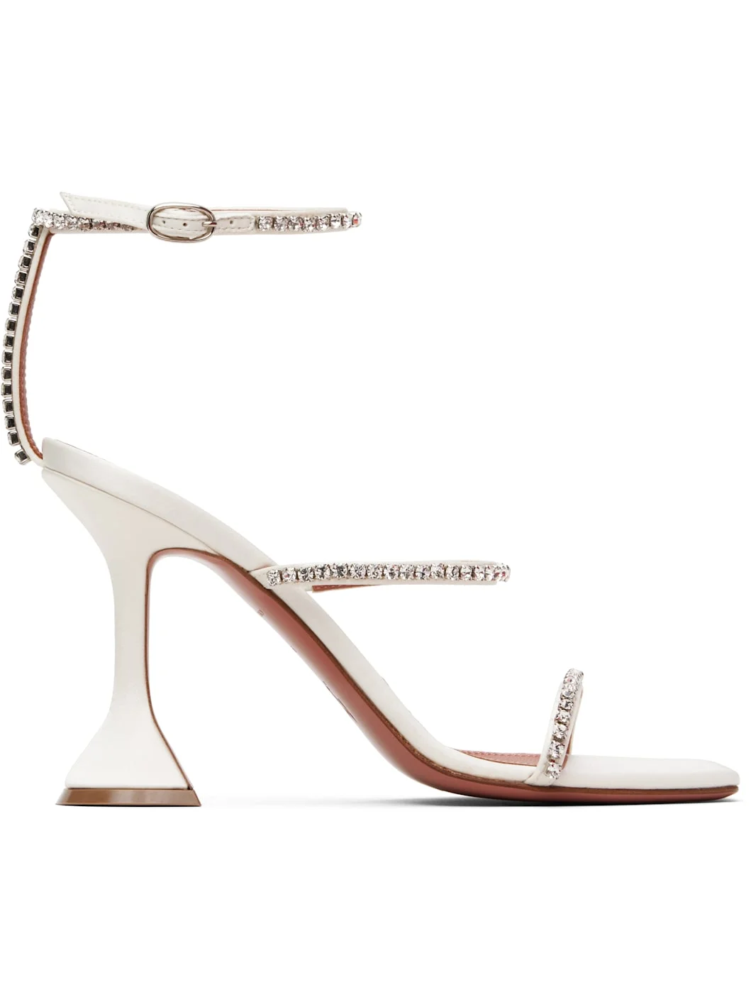 Satin heeled sandals. · Open square toe · Straps with crystals at vamp · Pin-buckle ankle strap with crystals · Leather-covered spool heel with rubber injection · Leather sole with rubber injection · Heel: H3.75" Supplier color: Ivory Lace/Ivory Nappa Upper: textile. Sole: leather, rubber. Made in Italy 261415F125020