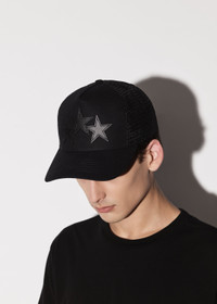 HOUSE SIGNATURE GRAPHICS ILLUSTRATE ACCESSORIES, ROOTED IN WEST COAST SAVOIR-FAIRE. THE CANVAS AND MESH 3 STAR TRUCKER HAT FEATURES LEATHER STAR APPLIQUÉS AND IS FINISHED WITH A CURVED BRIM, EMBROIDERED EYELETS AND DOUBLE SNAPBACK FASTENING. CORE COLLECTION MADE IN USA SHELL: 100% COTTON, LINING: 100% LYOCELL, MESH: 100% POLYESTER, APPLIQUÉ: BOVINE LEATHER