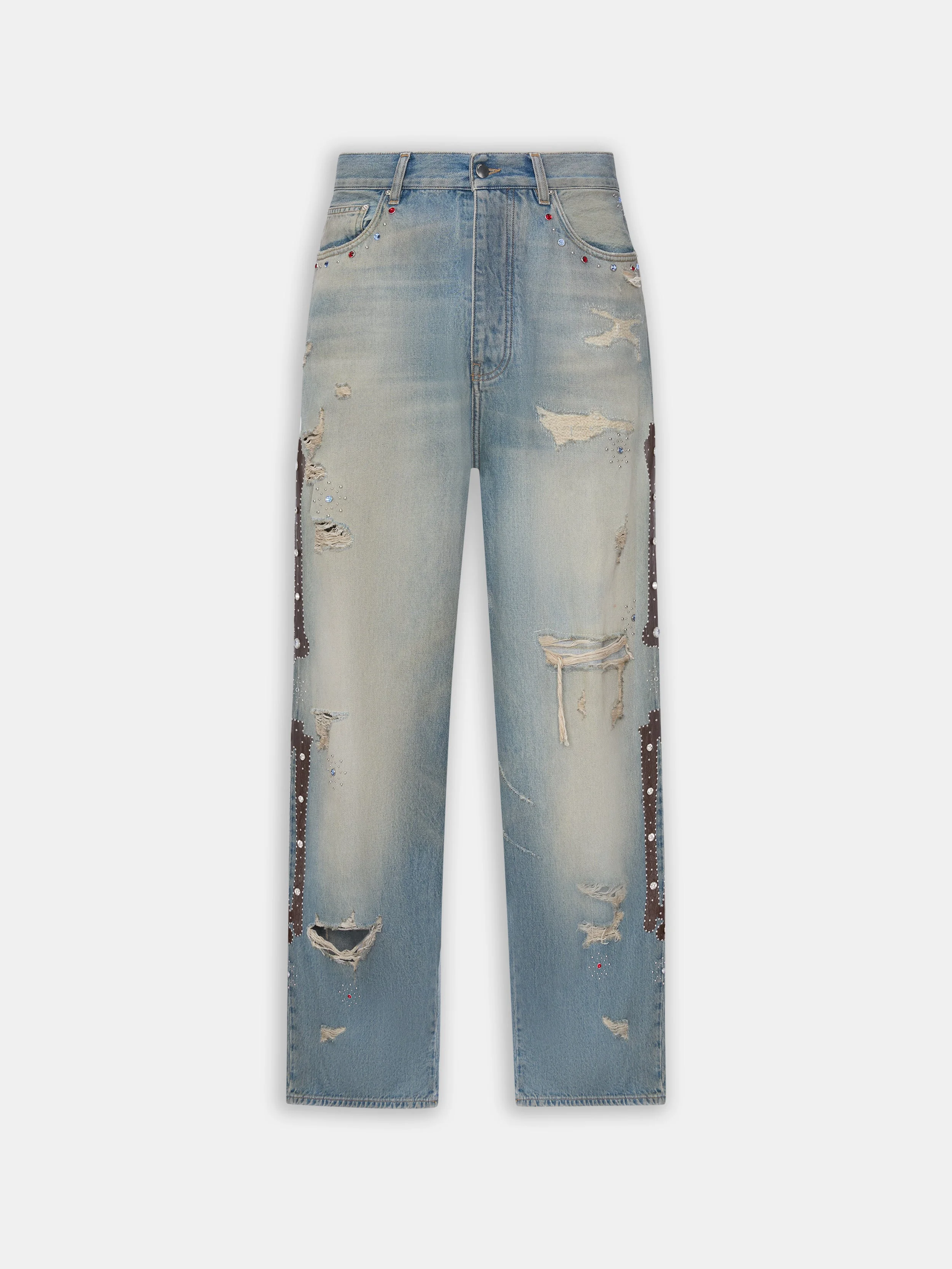 FOR PRE-SPRING 2026 WOMENSWEAR, HOUSE SIGNATURE DENIM IS MADE MEMORABLE WITH RHINESTONE RIVETS AND STARBURST STUD EMBELLISHMENTS. THE BONES STUDDED JEAN IS ILLUSTRATED WITH CROC-EMBOSSED LEATHER BONE APPLIQUES AND DISTRESSED AND REPAIRED FOR A LIVED-IN APPEARANCE. PRE-SPRING 2026 COLLECTION MADE IN ITALY 100% COTTON THIS GARMENT HAS UNDERGONE A SPECIAL PROCESS WHICH RESULTS IN INTENTIONAL VARIATIONS OF SHADING AND COLOR, AND ADD TO THE PIECE'S UNIQUE CHARACTERISTICS. THIS MAY LEAD TO BLEEDING OR DYE TRANSFER. PLEASE USE CAUTION WHEN WASHING OR DRY-CLEANING THIS ITEM STYLE:AWBMJE1015-596 SIZE & FIT MODEL MEASUREMENTS: HEIGHT: 5’9.5" CHEST: 31" WAIST: 24" HIP: 35" PRODUCT MEASUREMENTS (SIZE 26): WAIST: 32" RISE: 13" HIP: 20"" INSEAM: 33"
