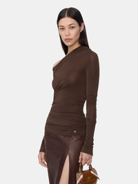 AUTUMN-WINTER 2025 WOMENSWEAR INTRODUCES ROMANTIC SILHOUETTES CREATED THROUGH A PURPOSEFUL PLAY IN FORM AND MATERIAL. THE MA OFF THE SHOULDER LONG SLEEVE TOP IS DESIGNED IN AN ASYMMETRICAL FORM WITH SIDE RUCHING AND ELONGATED SLEEVES. AUTUMN-WINTER 2025 COLLECTION MADE IN ITALY 96% COTTON, 4% ELASTANE THIS GARMENT HAS UNDERGONE A SPECIAL PROCESS WHICH RESULTS IN INTENTIONAL VARIATIONS OF SHADING AND COLOR, AND ADD TO THE PIECE'S UNIQUE CHARACTERISTICS. THIS MAY LEAD TO BLEEDING OR DYE TRANSFER. PLEASE USE CAUTION WHEN WASHING OR DRY-CLEANING THIS ITEM STYLE:AWTPLS1006-200 SIZE & FIT MODEL MEASUREMENTS: HEIGHT: 5’9.5" CHEST: 31.5" WAIST: 23.5" HIP: 35" PRODUCT MEASUREMENTS (SIZE 38): CHEST: 30.5" LENGTH: 24.4" SLEEVE LENGTH: 33.7"