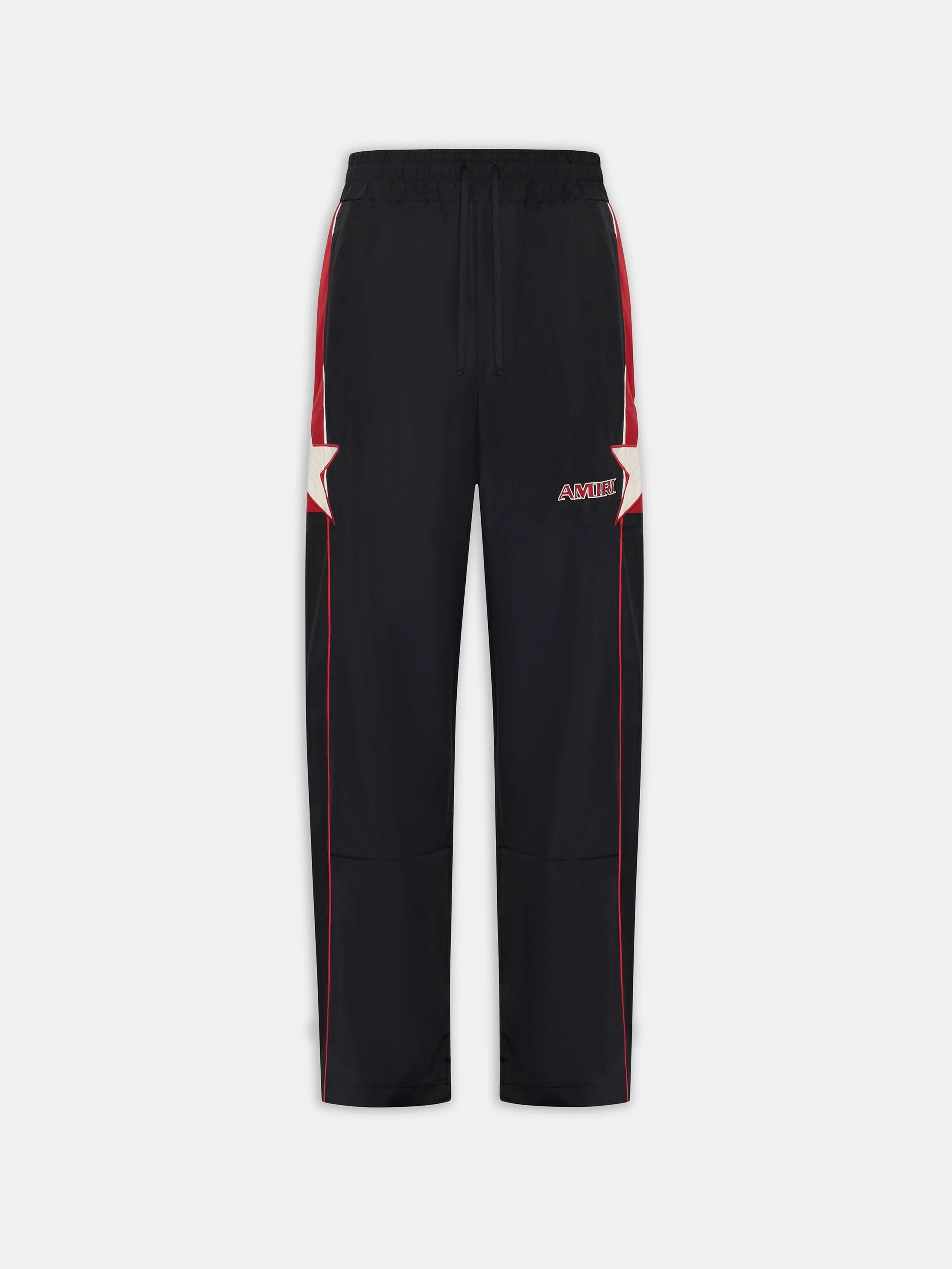 FOR PRE-SPRING 2026, ELEVATED TAKES ON TIME-HONORED SPORTSWEAR CAPTURE THE EFFORTLESS ATTITUDE OF THE OFF-DUTY ATHLETE. THE AMIRI SPORT TRACK PANT IS ILLUSTRATED WITH PATCH APPLIQUES AND FINISHED WITH CONTRAST PIPING, SIDE POCKETS, AND AN ELASTIC WAISTBAND WITH DRAWCORD. PRE-SPRING 2026 COLLECTION MADE IN ITALY 100% POLYESTER THIS GARMENT HAS UNDERGONE A SPECIAL PROCESS WHICH RESULTS IN INTENTIONAL VARIATIONS OF SHADING AND COLOR, AND ADD TO THE PIECE'S UNIQUE CHARACTERISTICS. THIS MAY LEAD TO BLEEDING OR DYE TRANSFER. PLEASE USE CAUTION WHEN WASHING OR DRY-CLEANING THIS ITEM STYLE:AMBMPA1003-001 SIZE & FIT MODEL MEASUREMENTS: HEIGHT: 6’2” CHEST: 35.5" WAIST: 28" HIP: 34.5" PRODUCT MEASUREMENTS (SIZE M): WAIST: 31" RISE: 12" HIP: 43" INSEAM: 32"