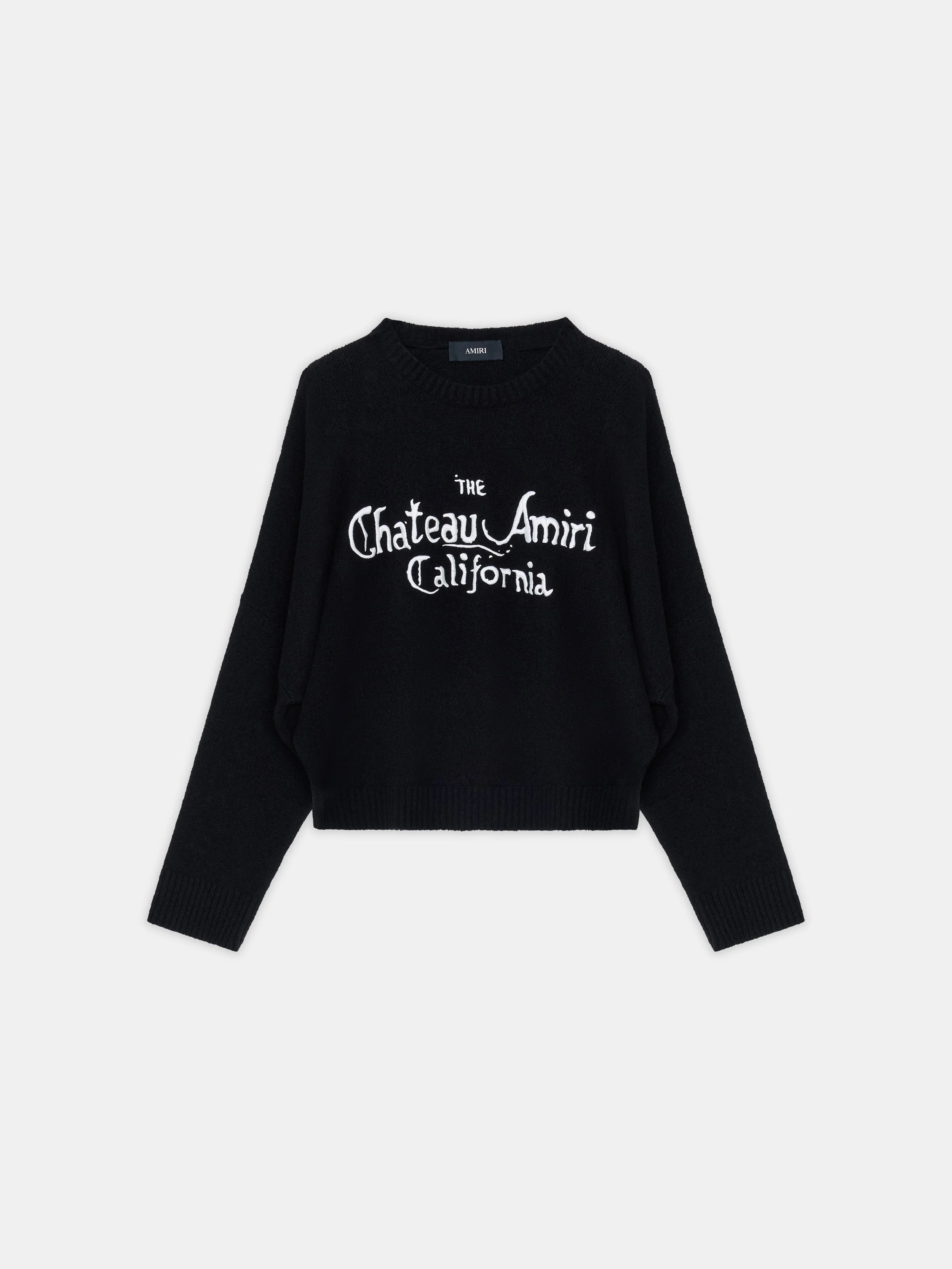 EVOKING ROMANTIC NOTIONS OF ESCAPISM, SPRING-SUMMER 2026 INTRODUCES CHATEAU AMIRI, AN IMAGINED PREMIER HOTEL IN THE HEART OF HOLLYWOOD. THE CHATEAU AMIRI SWEATER IS DESIGNED IN A RELAXED FIT WITH RIB KNIT FINISHES AND SEASONAL LOGO EMBROIDERY. SPRING-SUMMER 2026 COLLECTION MADE IN ITALY 73% COTTON, 27% NYLON THIS GARMENT HAS UNDERGONE A SPECIAL PROCESS WHICH RESULTS IN INTENTIONAL VARIATIONS OF SHADING AND COLOR, AND ADD TO THE PIECE'S UNIQUE CHARACTERISTICS. THIS MAY LEAD TO BLEEDING OR DYE TRANSFER. PLEASE USE CAUTION WHEN WASHING OR DRY-CLEANING THIS ITEM STYLE:AWTOKN1038-001 SIZE & FIT MODEL MEASUREMENTS: HEIGHT: 6'2" CHEST: 38.5" WAIST: 30.5" HIP: 37.5" PRODUCT MEASUREMENTS (SIZE XS): CHEST: 28" SHOULDER: 32" LENGTH: 21.5" SLEEVE LENGTH (FROM CENTER BACK): 31"