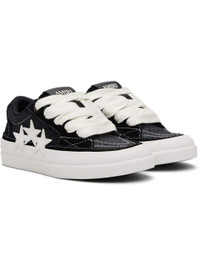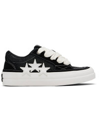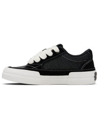 Low-top suede and glittered canvas sneakers. · Lace-up closure · Logo patch at padded tongue · Padded collar · Buffed leather graphic appliques at outer side · Mesh lining · Rubberized logo patch at heel · Textured rubber midsole · Treaded rubber sole Supplier color: Black Upper: textile, leather. Sole: rubber. Made in Cambodia 252886F128033