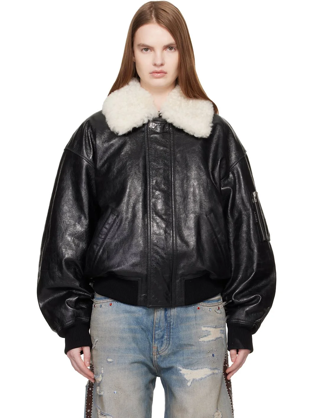 Grained lambskin bomber jacket. · Detachable shearling trim at spread collar · Zip closure with press-stud placket · Logo hardware at front · Welt pockets at waist · Rib-knit hem and cuffs · Dropped shoulders · Zip pocket and printed logo at sleeve · Full viscose satin lining Supplier color: Black Body: 100% lambskin. Trim: 100% lambskin. Lining: 100% viscose. Made in Turkey 261886F064001