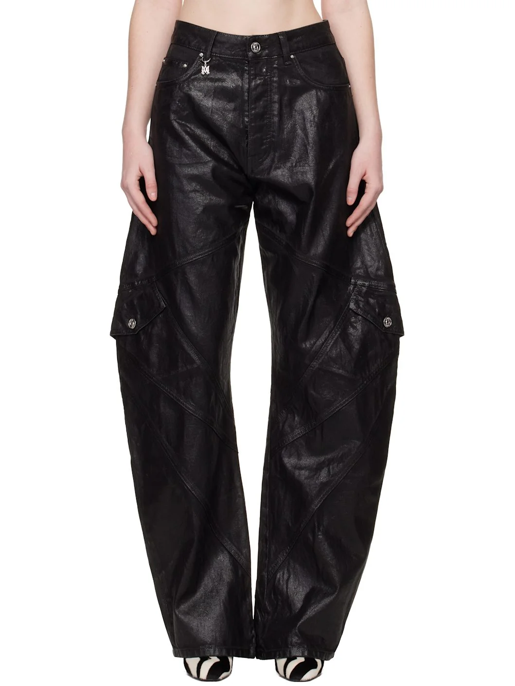 Waxed non-stretch denim jeans. · Paneled construction · Belt loops · Five-pocket styling · Button fly · Logo charm at front waistband · Flap pocket at outseams · Logo patch at back waistband · Logo plaque at back pocket · Logo-engraved silver-tone hardware Supplier color: Black wax Body: 100% cotton. Trim: 65% polyester, 35% cotton. Made in Italy 261886F069004