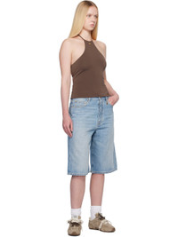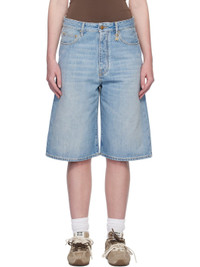 Non-stretch denim shorts. Fading, whiskering, and subtle distressing throughout. · Belt loops · Five-pocket styling · Button fly · Logo charm at belt loop and back pocket · Logo patch at back waistband · Contrast stitching in tan Supplier color: Stone indigo Body: 100% cotton. Lining: 65% polyester, 35% cotton. Made in Italy 252886F088002