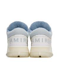 Low-top buffed leather, suede, and mesh sneakers in blue and white. · Graphic perforated detailing at toe · Lace-up closure · Logo patch and hardware at padded tongue · Padded collar · Logo hardware at outer side · Perforated detailing at sides · Logo embossed at heel counter · Terry cloth lining · Logo embossed at textured rubber midsole · Treaded rubber sole Supplier color: Ice