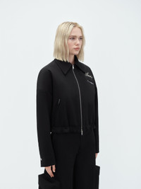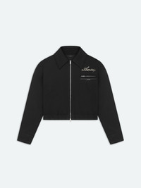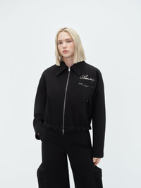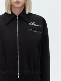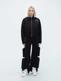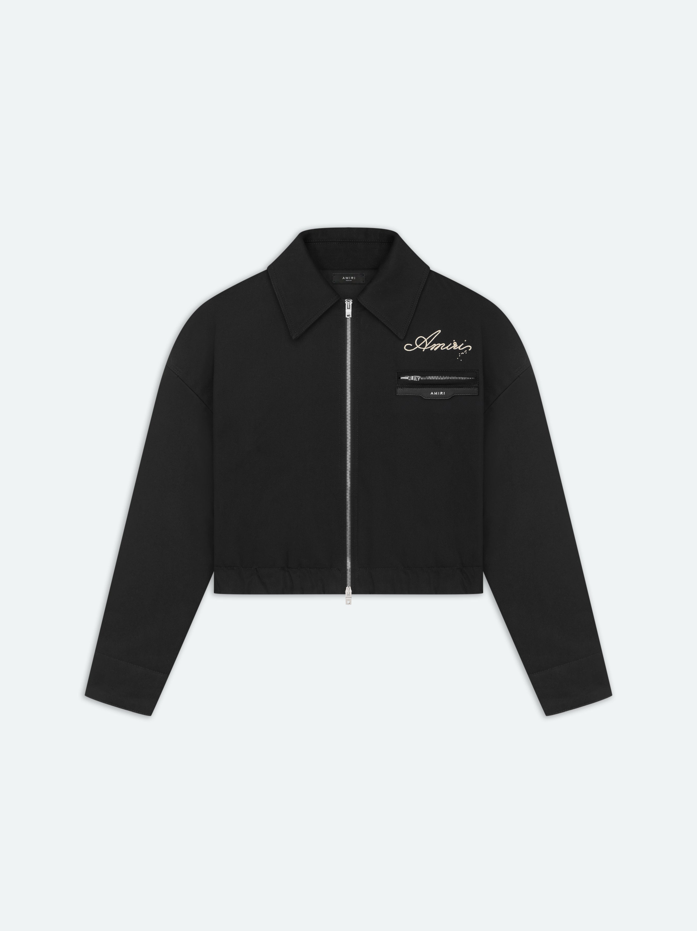 THIS JACKET ELEVATES TRADITIONAL WORKWEAR THROUGH FINELY TUNED FORM AND ADORNMENT. IN A DIMENSIONAL, MIXED-MEDIA APPROACH, CRYSTALS ILLUMINATE A CELEBRATORY TOAST ALONGSIDE THE AMIRI LOGO SPELLED OUT IN A STRING OF PEARL ADORNMENTS. A FUTURE HEIRLOOM OF EXQUISITE ARTISTRY, THIS JACKET IS FINISHED WITH DOUBLE ZIP CLOSURE, ELASTIC WAIST AND SNAPS AT THE CUFFS. PRE-SPRING 2024 COLLECTION MADE IN ITALY 100% COTTON DRY CLEAN ONLY