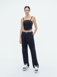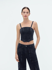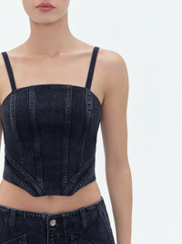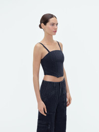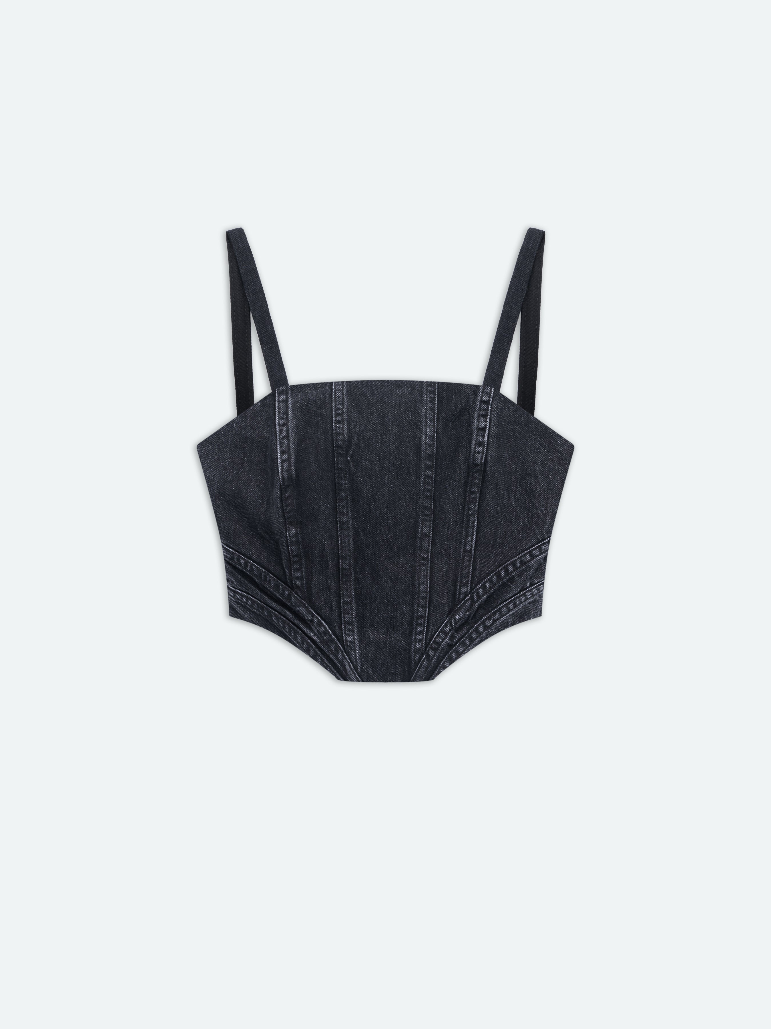 THIS SCULPTURAL CORSET SUBVERTS THIS TRADITIONAL LINGERIE SILHOUETTE IN WASHED DENIM. BONED CONSTRUCTION AND ARTFUL SEAMING SHAPE A DISTINCTIVE FORM WITH TAPERED HEM AND BACK DOUBLE ZIP CLOSURE. THIS CORSET IS A WORK OF METICULOUS CONSTRUCTION THAT COORDINATES SEAMLESSLY WITH THE CARGO LOOSE JEANS. PRE-SPRING 2024 COLLECTION MADE IN UNITED STATES 100% COTTON DRY CLEAN ONLY